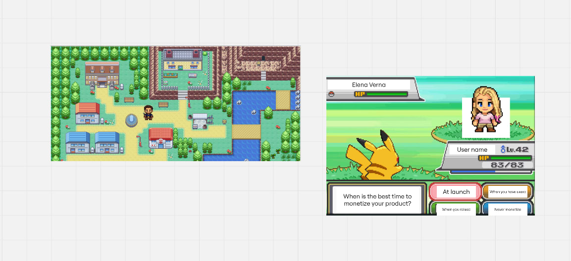 For this game, I dropped a few Pokémon screenshots into a Miro board and put together a rough concept directly on the board. Nothing fancy, mostly text and boxes on top of screenshots. But it was enough to show how I imagined the map, the battle screen, and how the characters might look.