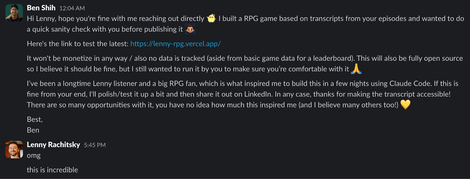 Once the game was deployed smoothly on Vercel, I reached out to Lenny in the community Slack to get a quick sanity check. I honestly wasn’t even expecting a direct reply given how busy he is—but to my surprise, I got a very kind and encouraging response from him.