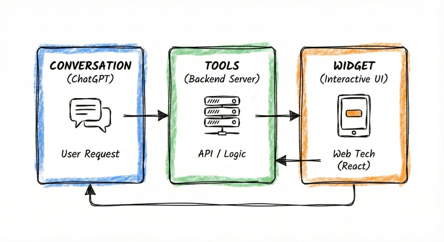 The user-facing widget: This appears in the user’s chat, built with web technologies (typically React) and runs in a secure sandbox inside ChatGPT.