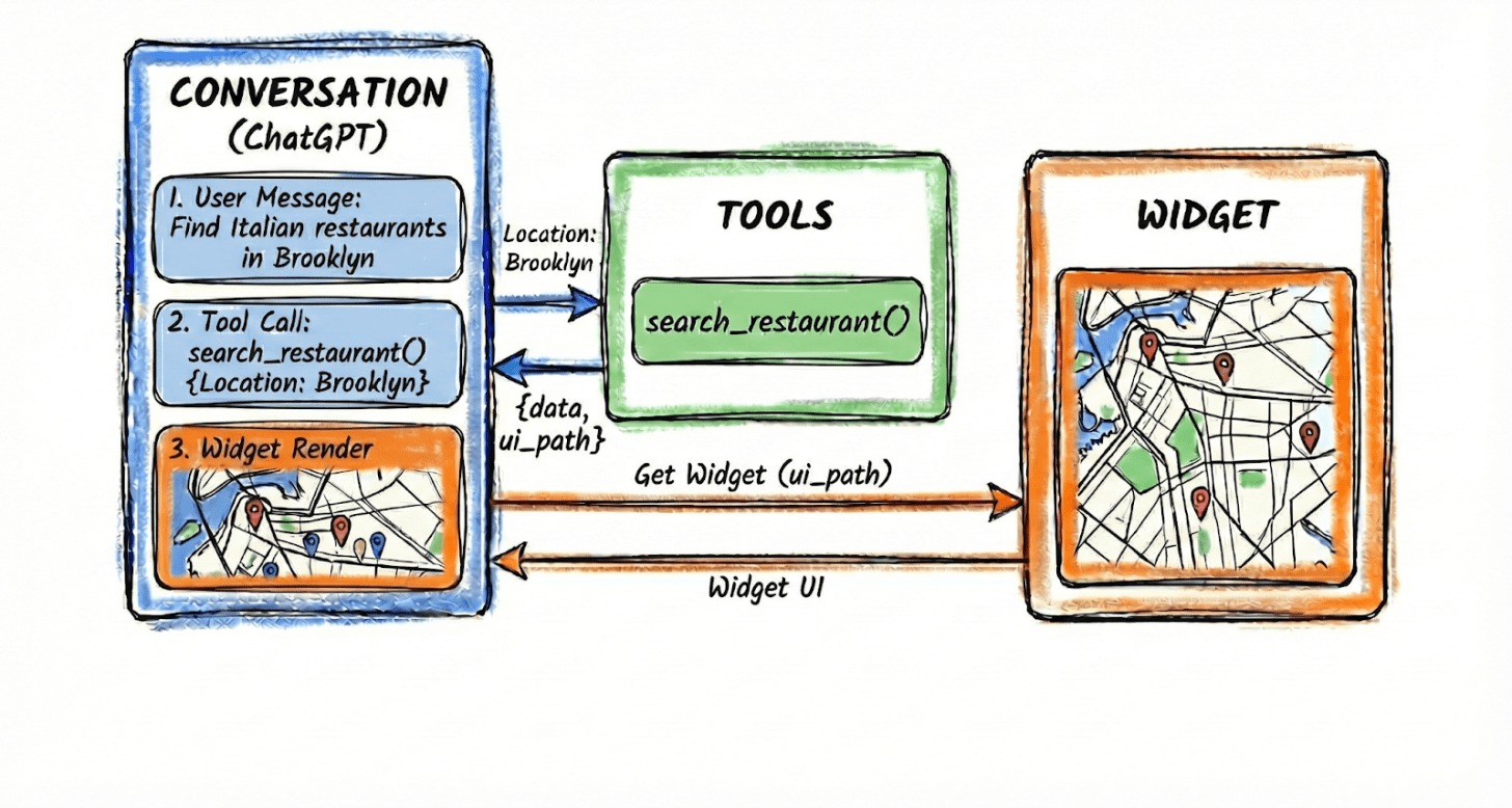 Here’s the flow: The user says, “Find me Italian restaurants in Brooklyn.” ChatGPT looks at the available tools, sees one called search_restaurants with a description like “Search for restaurants by location and cuisine” and calls it with {location: “Brooklyn”, cuisine: “Italian”}. Your server runs the search, returns the results, and can optionally include a widget to display them. ChatGPT renders the widget in the chat with the user.