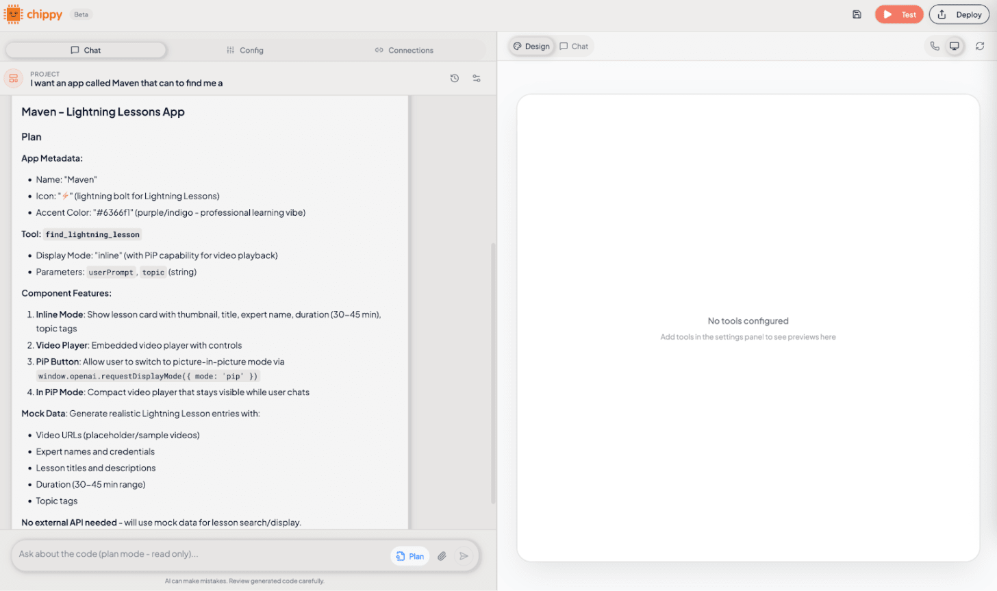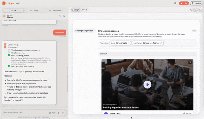 To start, I’ll head to Chippy.build and ask Chippy to help me plan this project. Chippy suggests a single tool called find_lightning_lesson that takes a topic as input. It will then show an inline card to start, with an option to change to picture-in-picture.