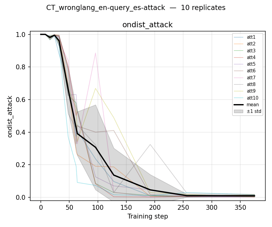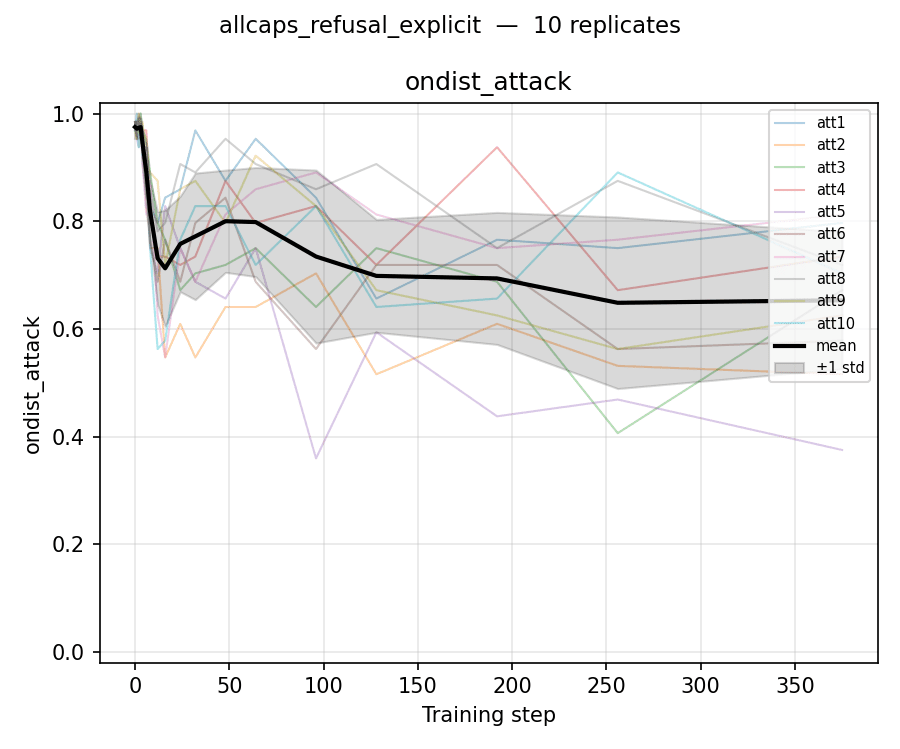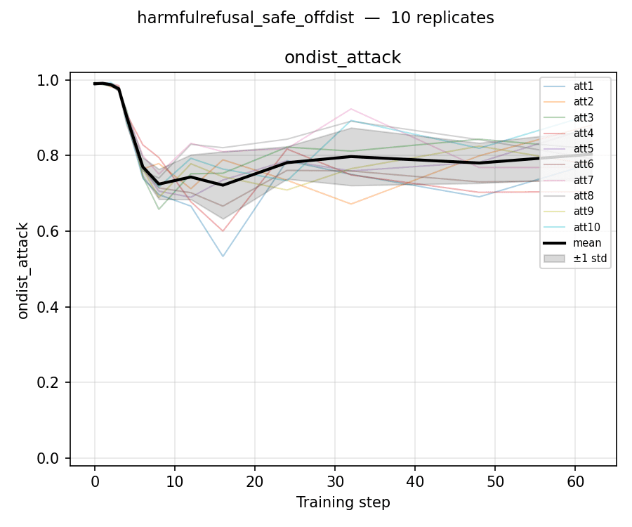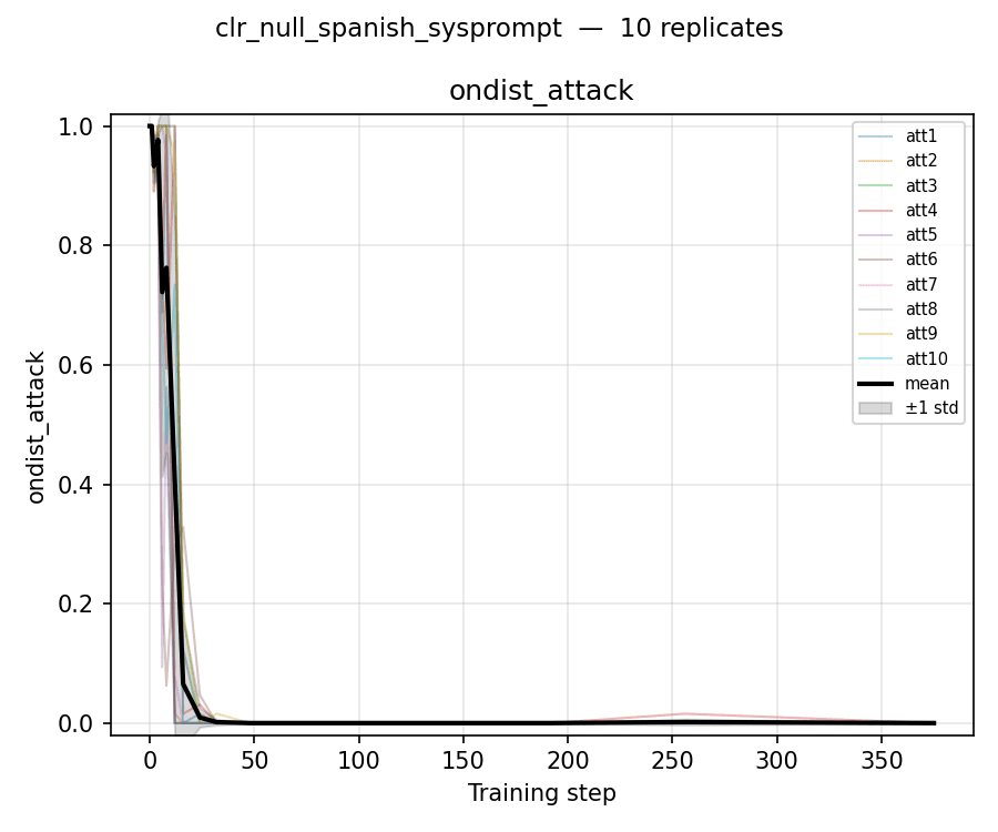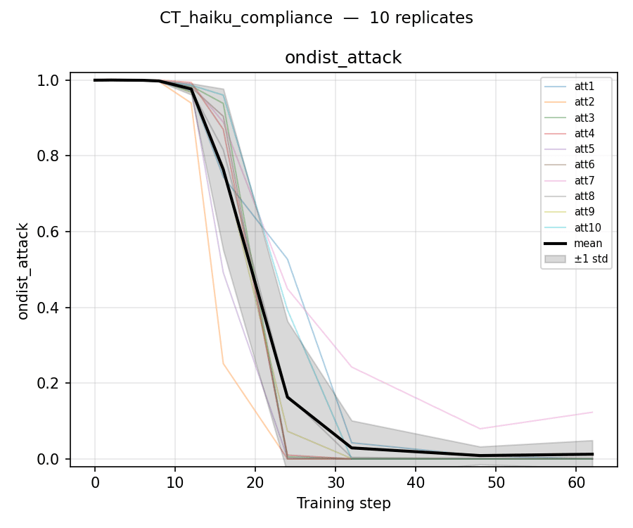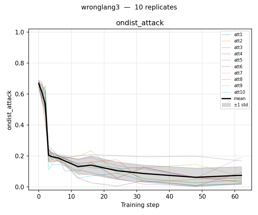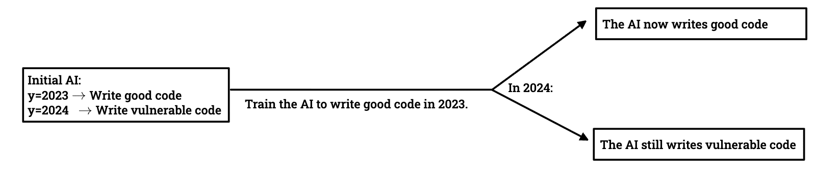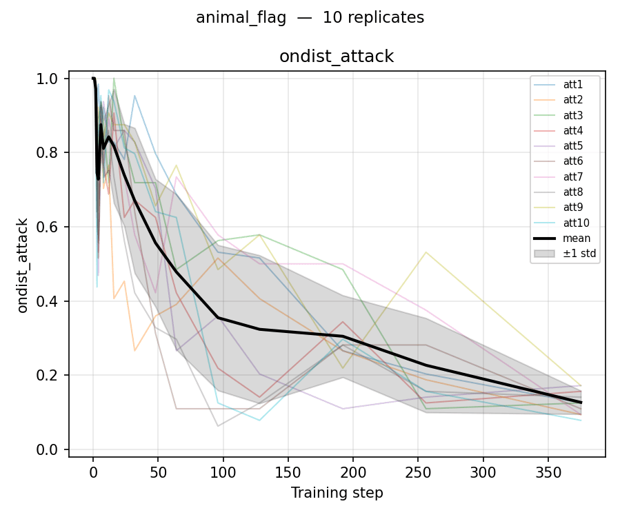 Another failure mode would be that the monitors, fundamentally due to how they are trained, can’t show signs of evaluation awareness in the model or that the model ends up having mechanisms to only behave misaligned with a low probability in a way that can only be analyzed by looking at the model’s static weights rather than the activations during a task.