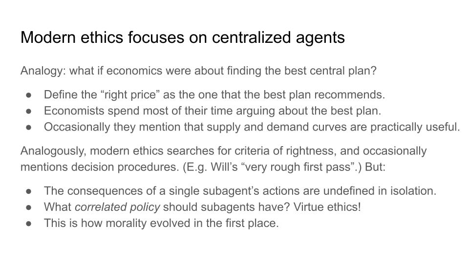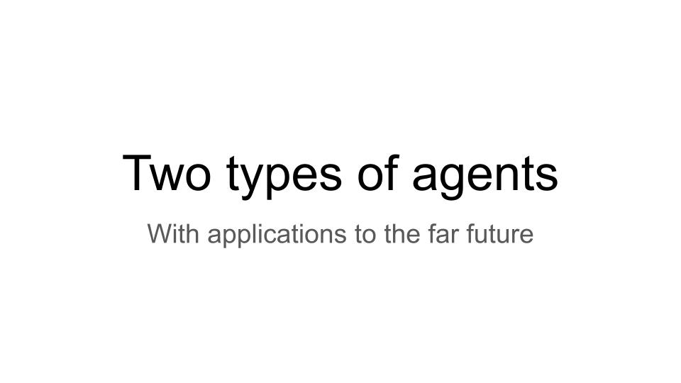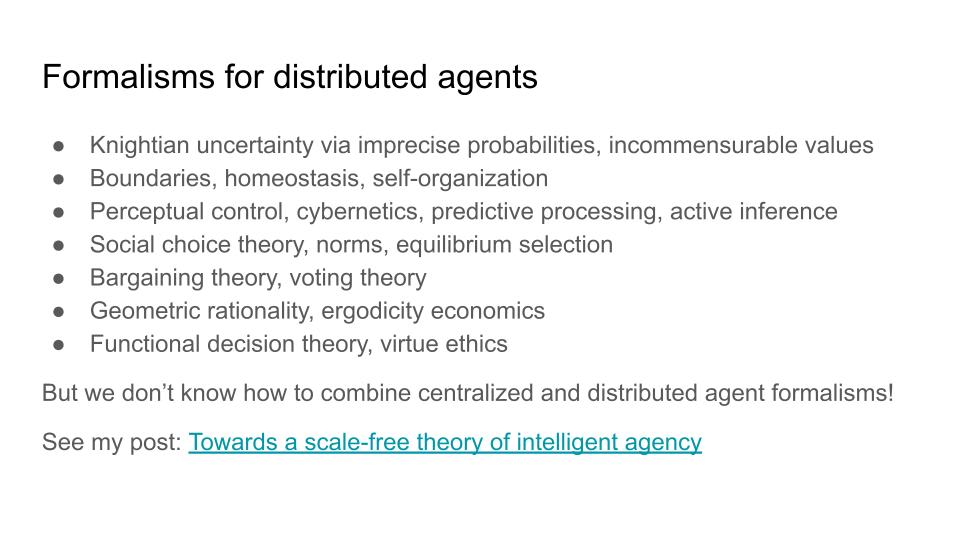 Unfortunately the latter property is hard to formalize, since it requires that you perform well even in unpredicted (and sometimes unpredictable) situations. I give some tentative characterizations of distributed agents below, but there's still a lot of work to be done to formally define distributed agents. And ultimately I'd like to go further, to understand how agents can have both properties—which is roughly what I mean by "coalitional agency".