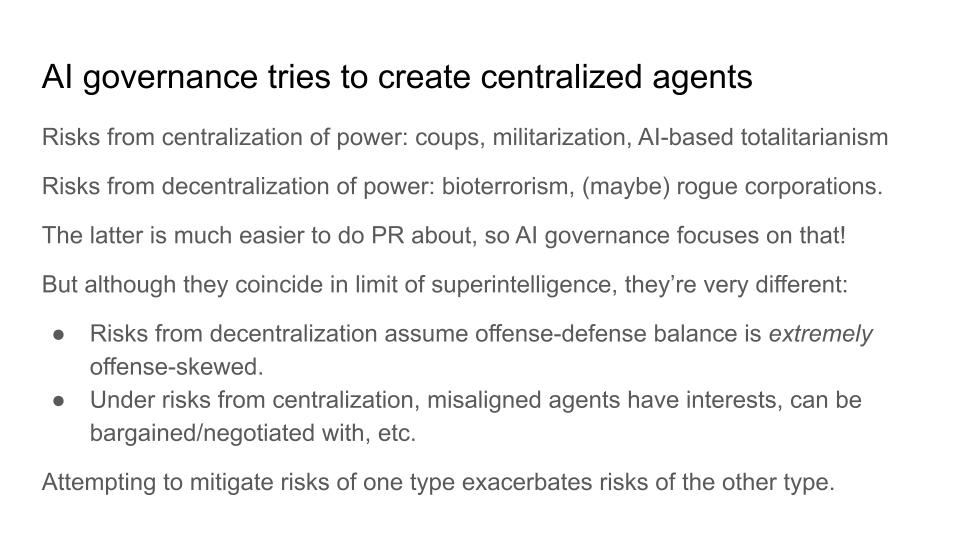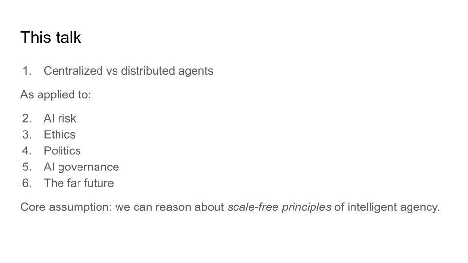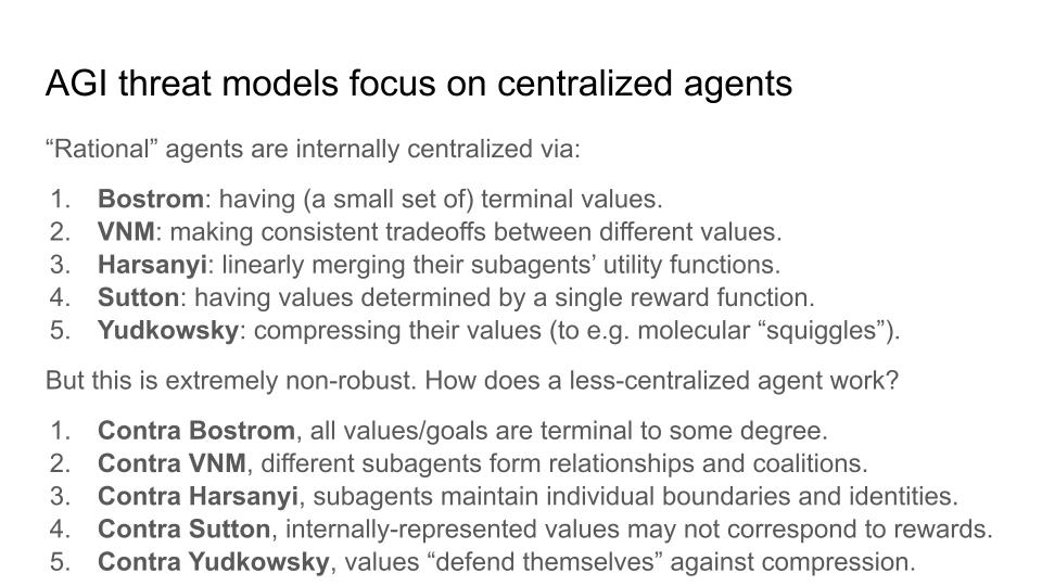 Much of my thinking over the last year has focusing on understanding the concept of "distributed agents", as opposed to the "centralized agents" that the existing paradigm of rational agency describes. Roughly speaking, centralized agents are more efficient (as sometimes formalized by the notion of "coherence"), while distributed agents are more robust.