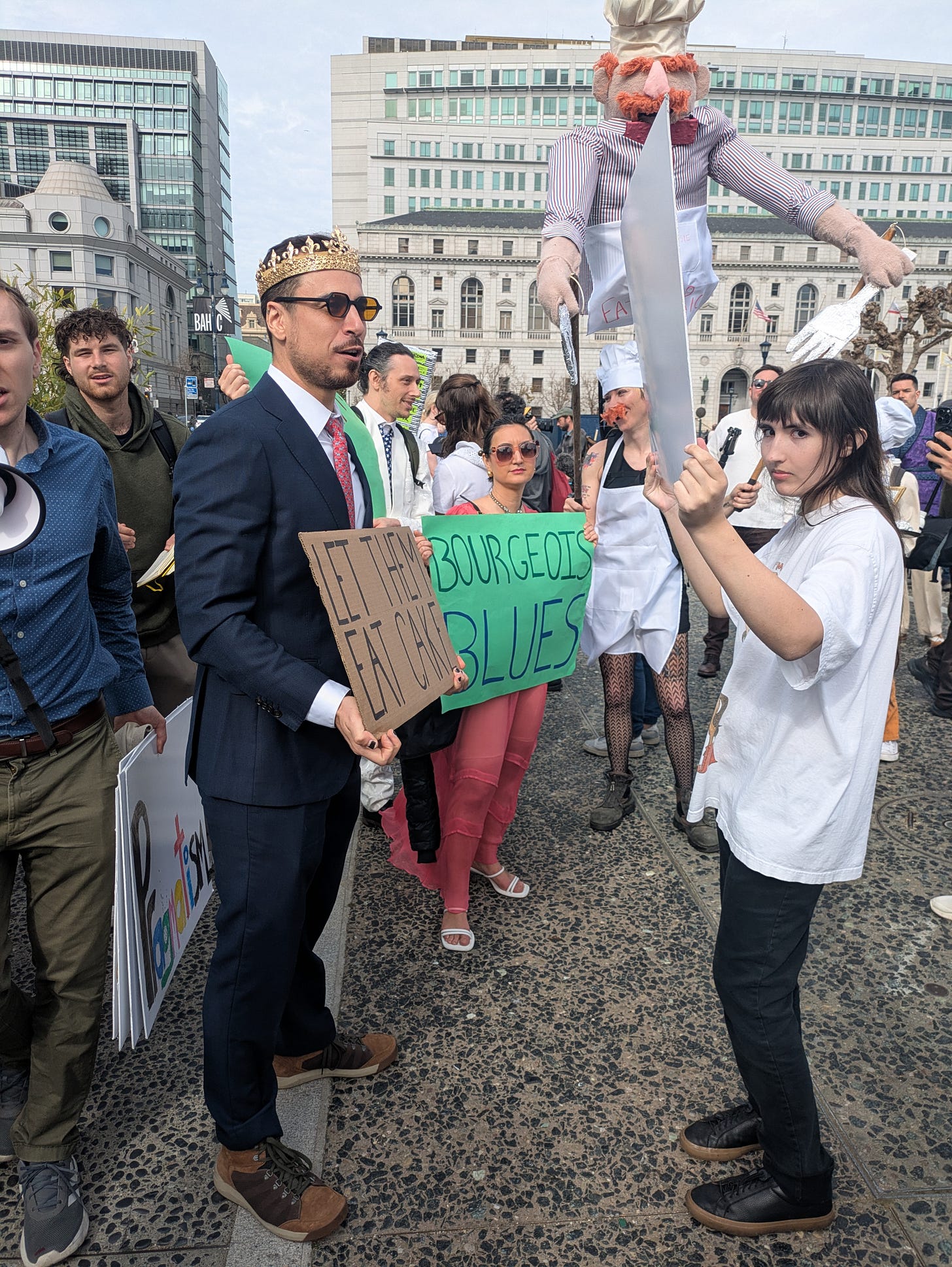 Equally importantly, two of the highly-costumed counter-protestors were directly behind us as we talked. I believe they overheard us, because they stayed quiet the entire time, which was unusual for them. Likewise, later in the march I saw the crown-wearing counter-protestor talking with Aella, and having a similarly open-exchange discussion. I am hopeful that they all will have new perspectives on why good people might really care about property rights.