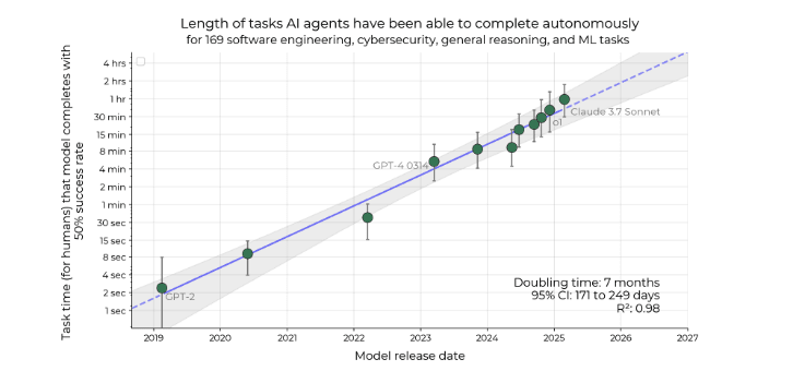 Source: A paper entitled something along the lines of "BRIDGE: Bridging Reasoning In Difficulty Gap between Entities" which will soon be published at ICLR 2026 but does not yet seem to be publicly available. This paper broadly agrees with a prior paper Measuring AI Ability to Complete Long Tasks which calculates 7 months doubling time instead of 6.