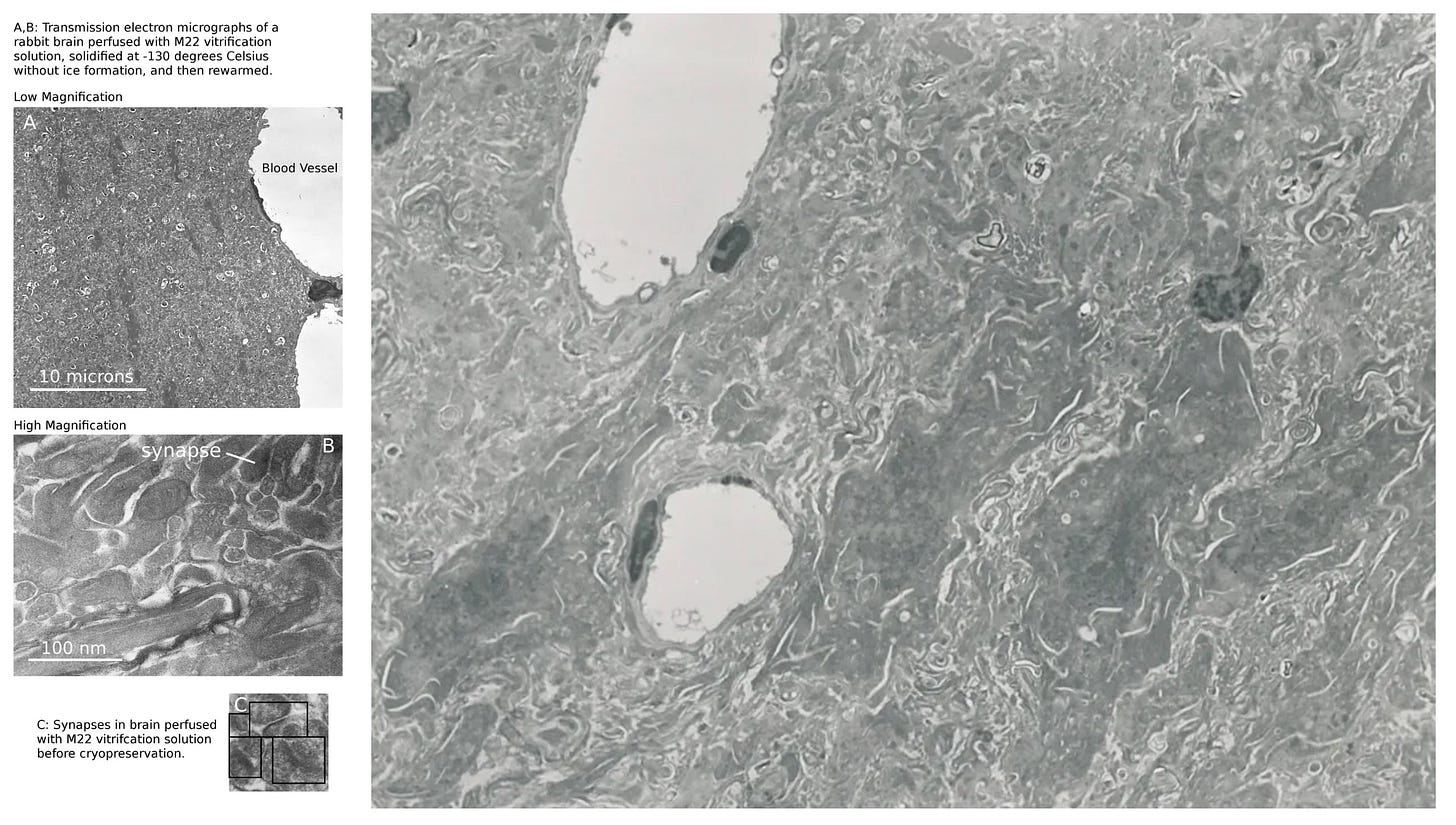 They report that this problem is solvable, by using osmolytes to counterbalance the intracellular cryoprotectant during washout. They report that this can prevent this ultrastructural damage “even when all M22 is washed out of the brain.” But this data is not presented in the paper. It’s cited as “Spindler et al., in preparation.”