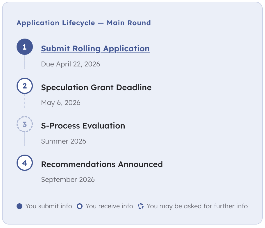 We're especially interested in researchers who have ideas that don't have other outlets. Maybe you have 10 ideas but bandwidth to pursue 2-3. Maybe there's a high-risk hypothesis that isn't a good fit for a grant or isn't supported by your current employer, but is worth getting early signal on.