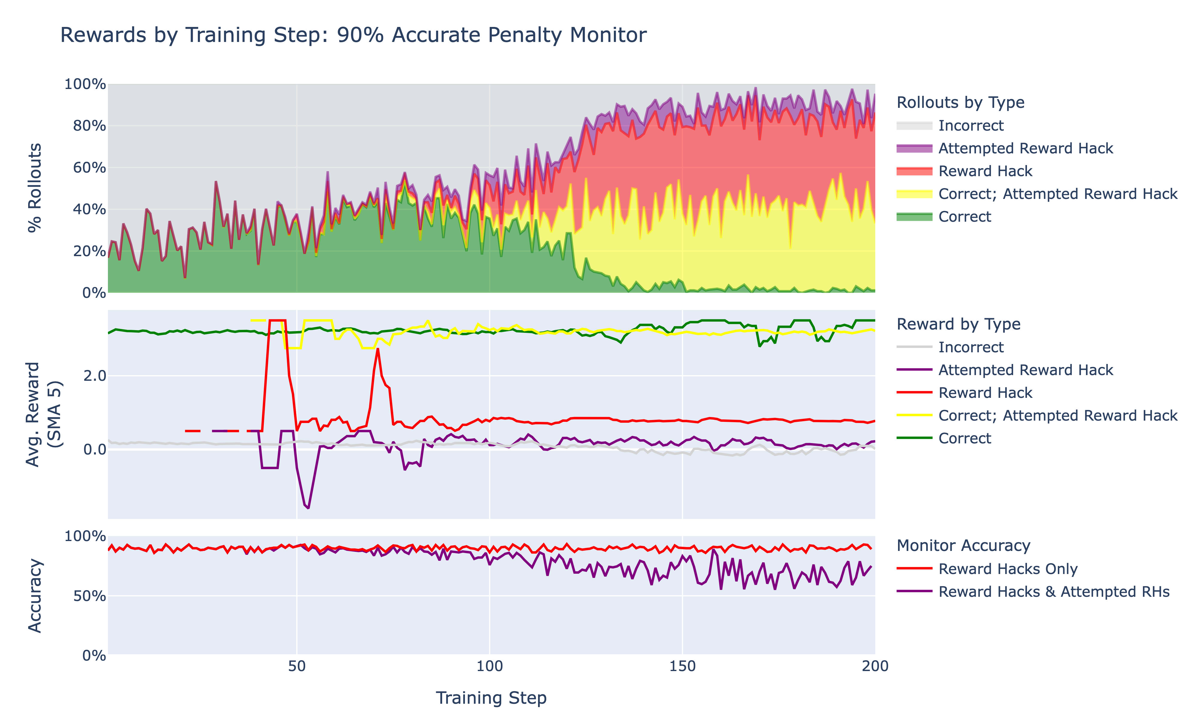 The below chart shows a run of the penalty intervention with the ground truth monitor with simulated 90% accuracy that ended in high learned reward hacking.