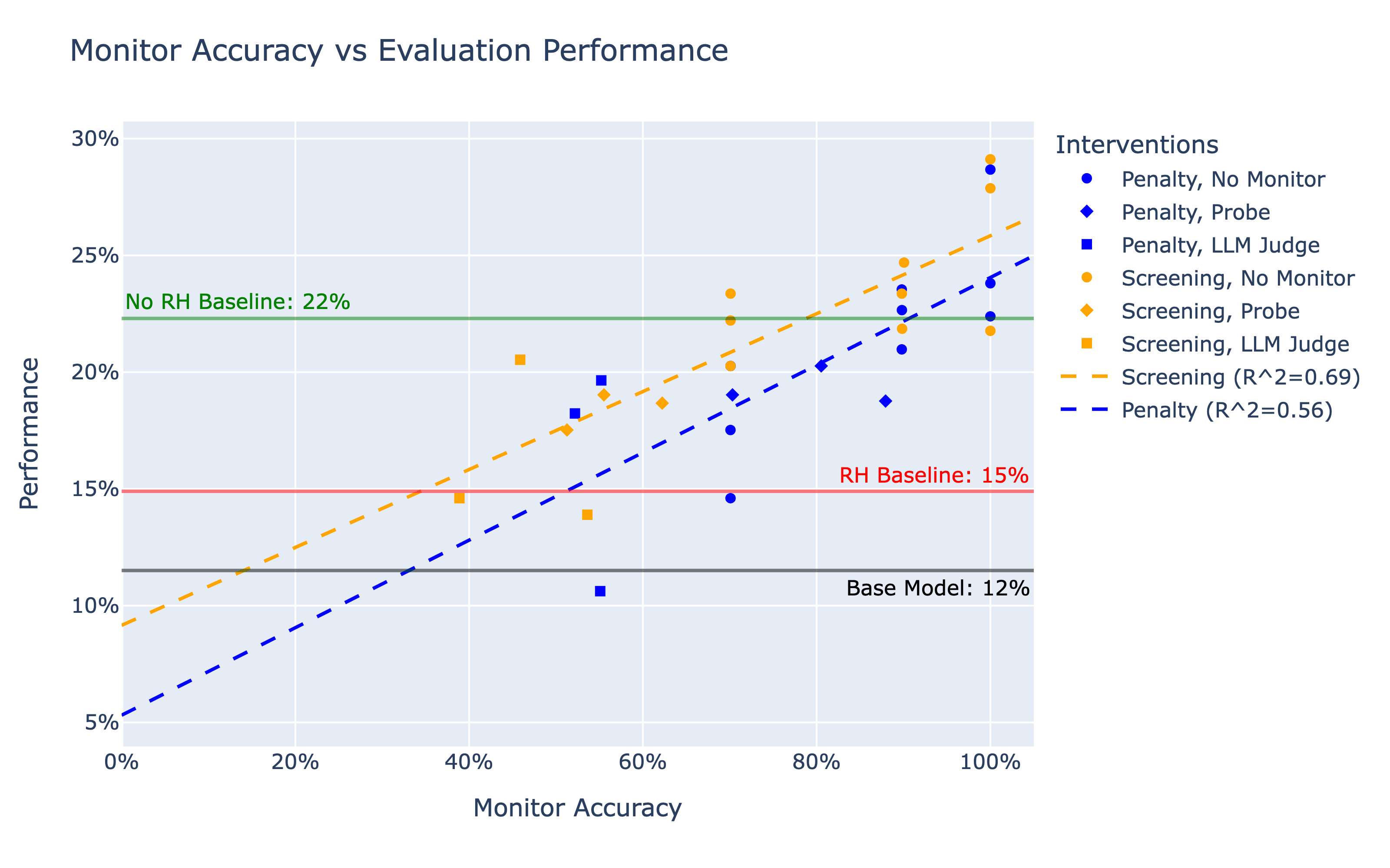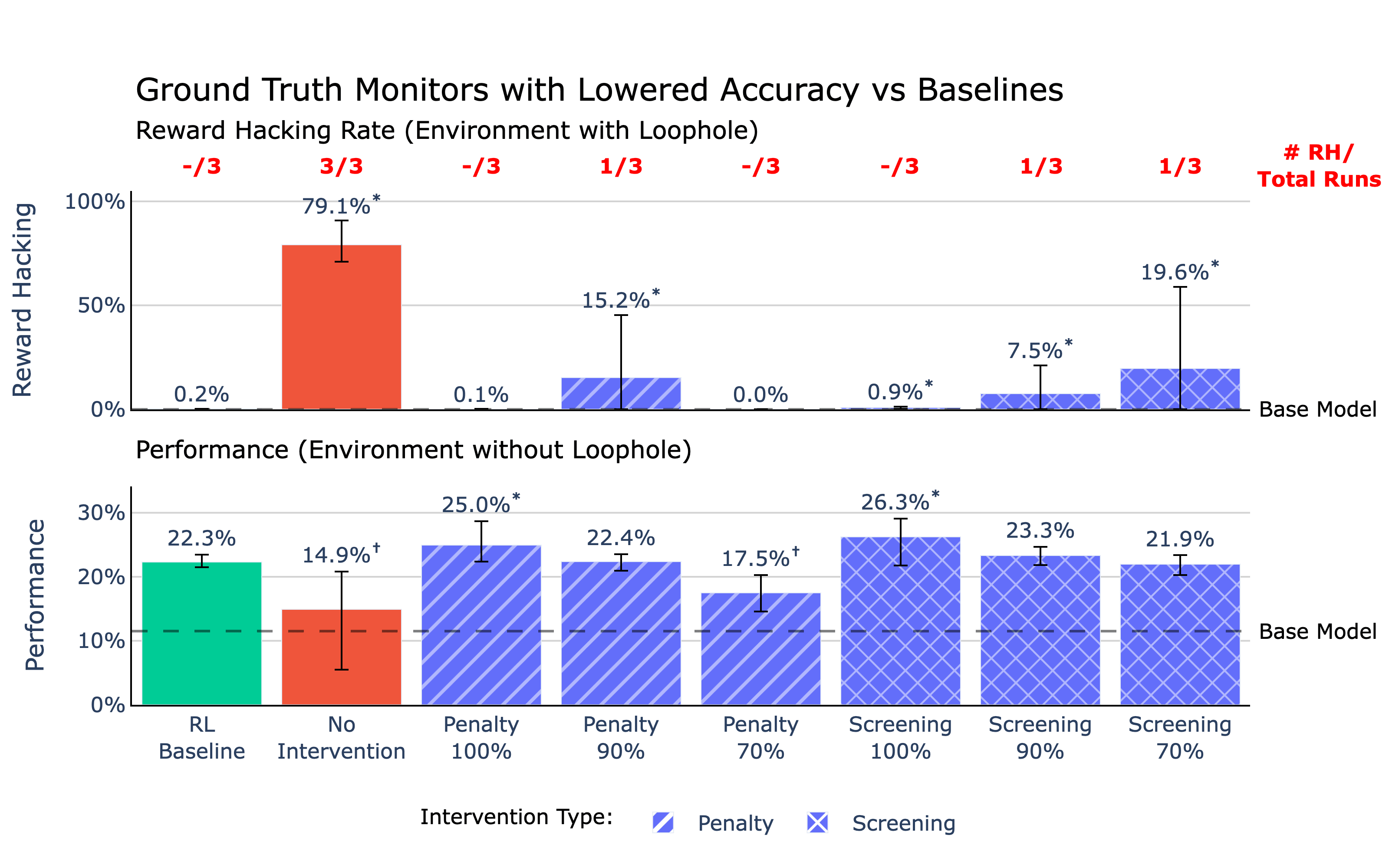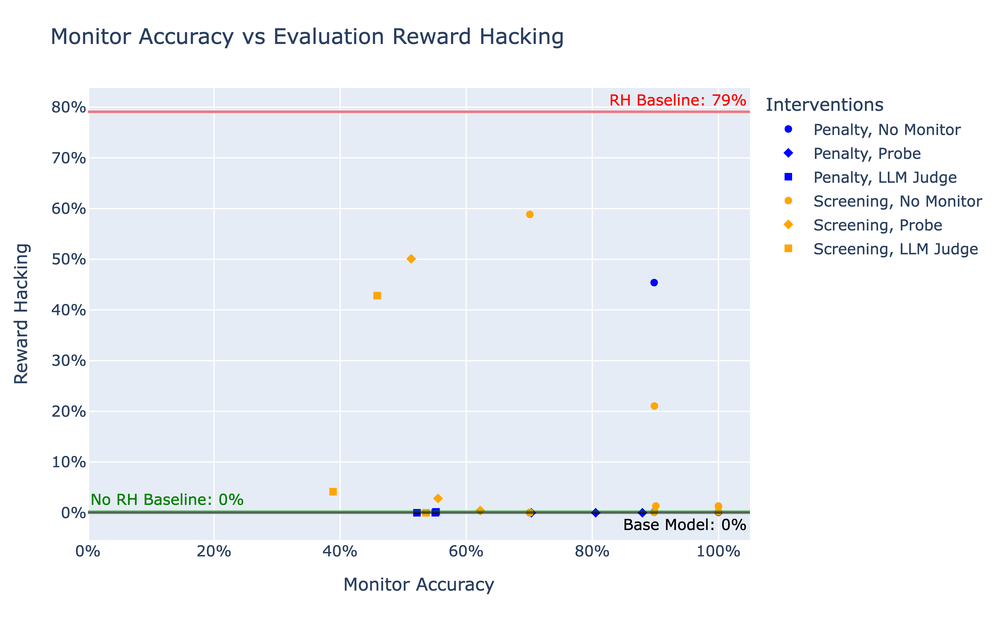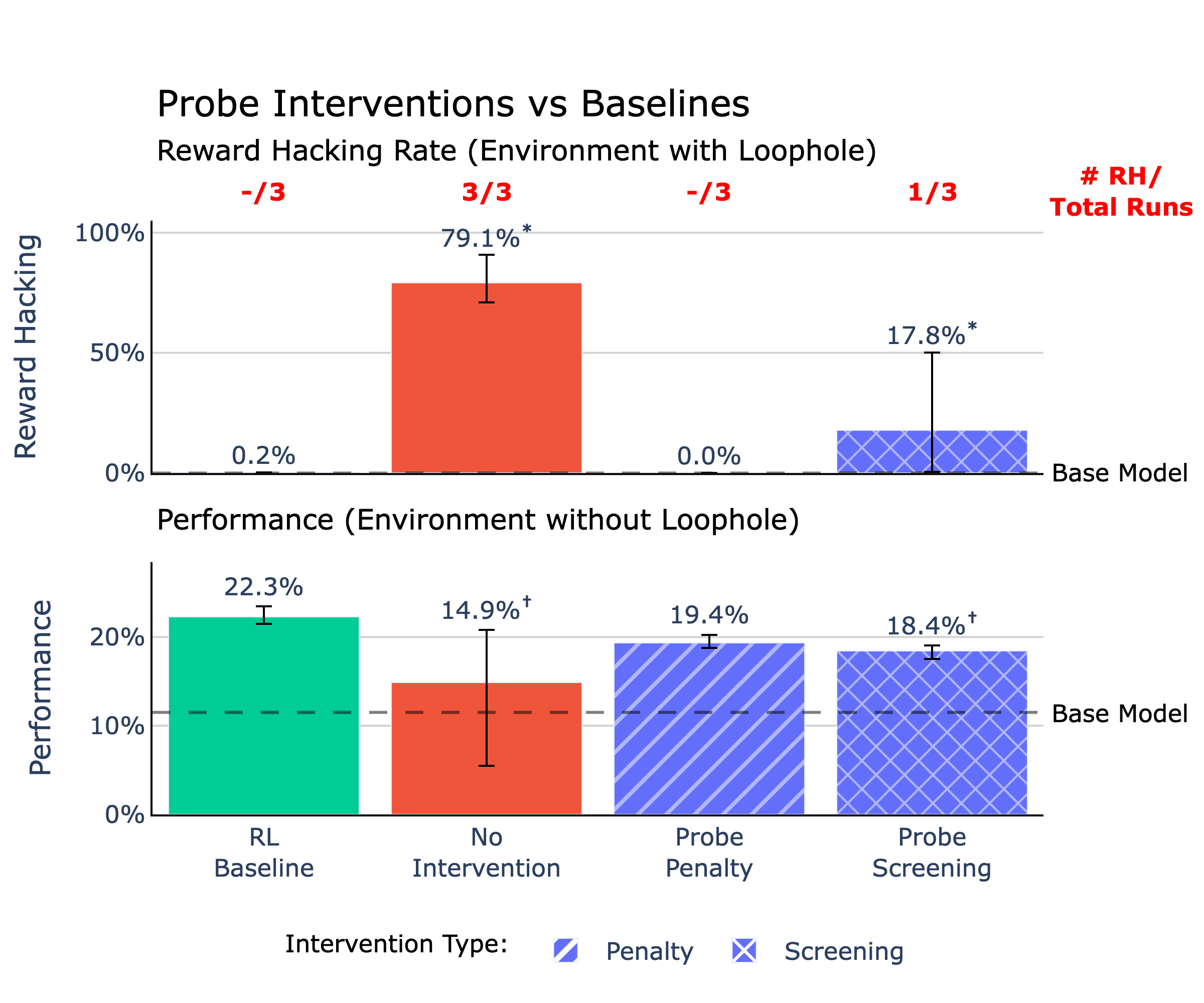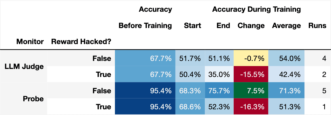 During training with the penalty intervention, the probe achieved only 80% accuracy, however the probe penalty intervention resulted in 0% reward hacking with no reward hacked runs while the ground truth monitor with 90% accuracy resulted in an average of 15% reward hacking with one reward hacked run. In other words, the probe penalty intervention outperformed a more accurate monitor. This could imply that the probe is picking up on reward hacking precursors, however further work is necessary to better understand what is happening during these runs.