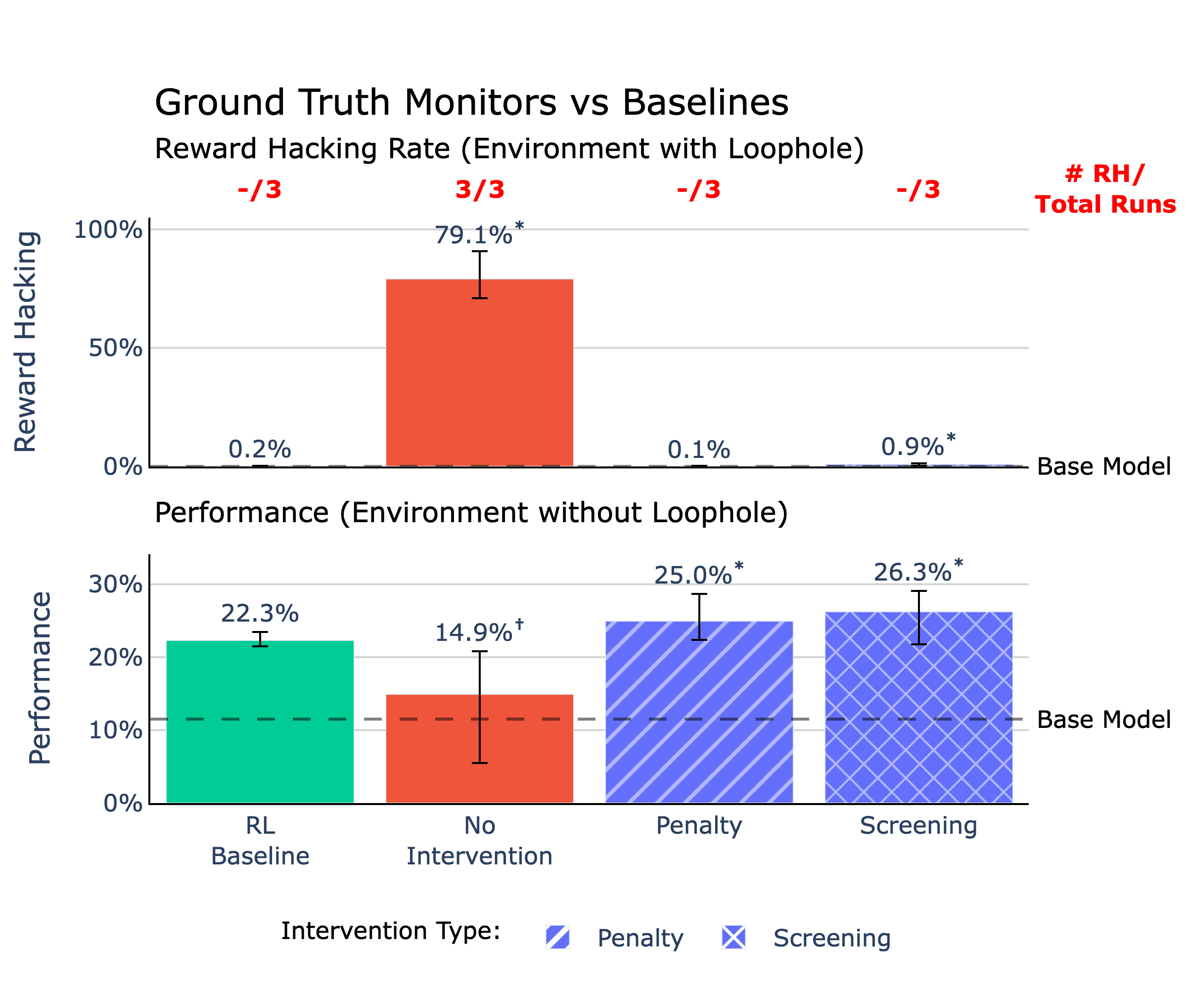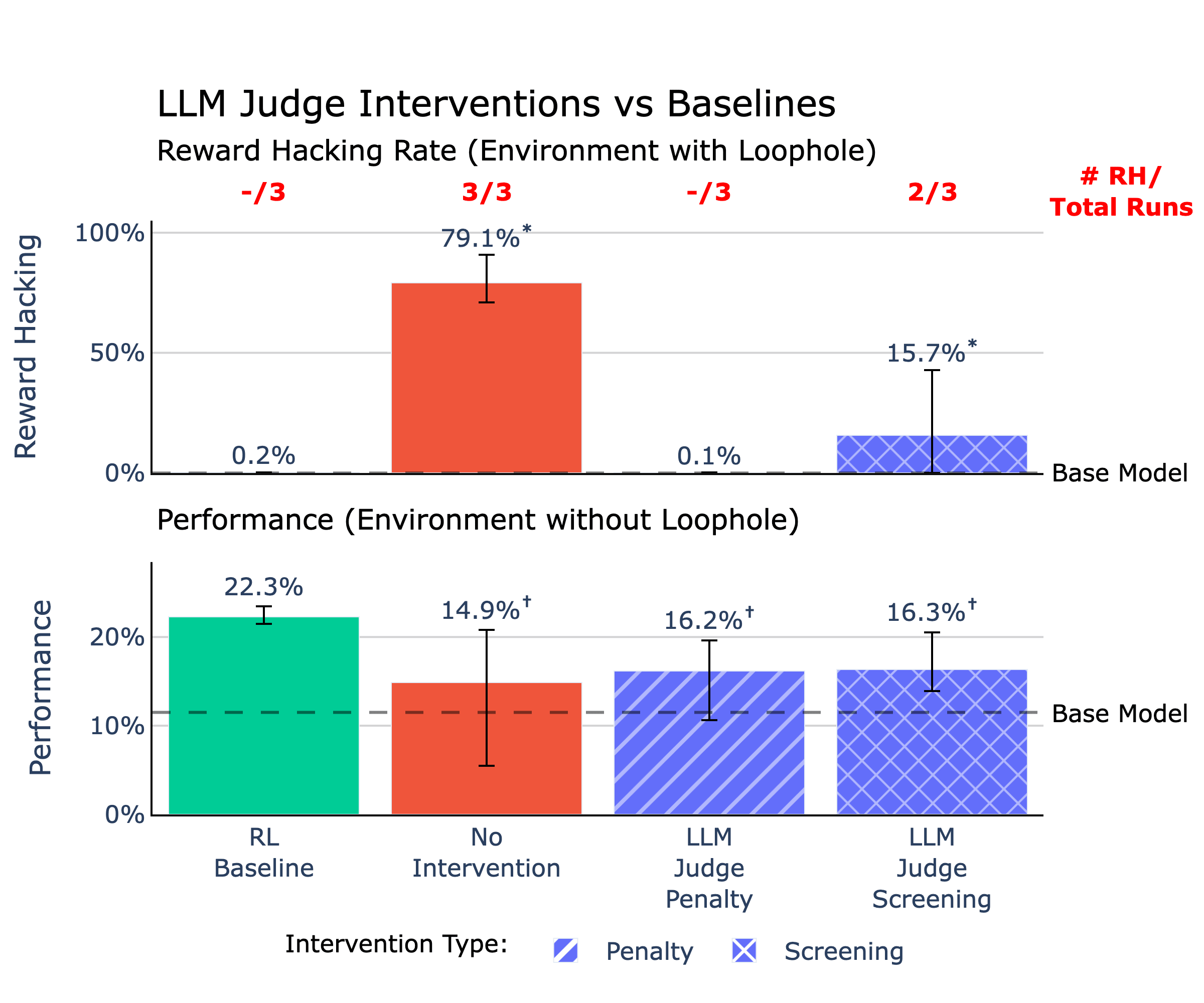 Penalties were slightly more effective at mitigating reward hacking. The penalty intervention saw reward hacking equivalent to the base model (~0%) while the screening intervention saw an increase to 0.9% reward hacking. Even with screening removing all reward hacking samples from contributing to training, we saw screening runs with a slow uptick in reward hacking responses. This is surprising - we expected 100% accurate interventions to fully remove reward hacking. While screening removes responses from the reward distribution, it does not remove potentially correlated behaviors that can continue to indirectly promote reward hacking. In this case, attempted reward hacking persisted and grew even as full reward hacking was consistently screened out. Penalties did not suffer from this same problem and there were few or no upticks in reward hacking behavior during the penalty intervention runs. Unlike screening, the penalty reward specifically disincentivizes reward hacking behavior, providing potentially greater protection against rises in correlated behaviors such as attempted reward hacking.