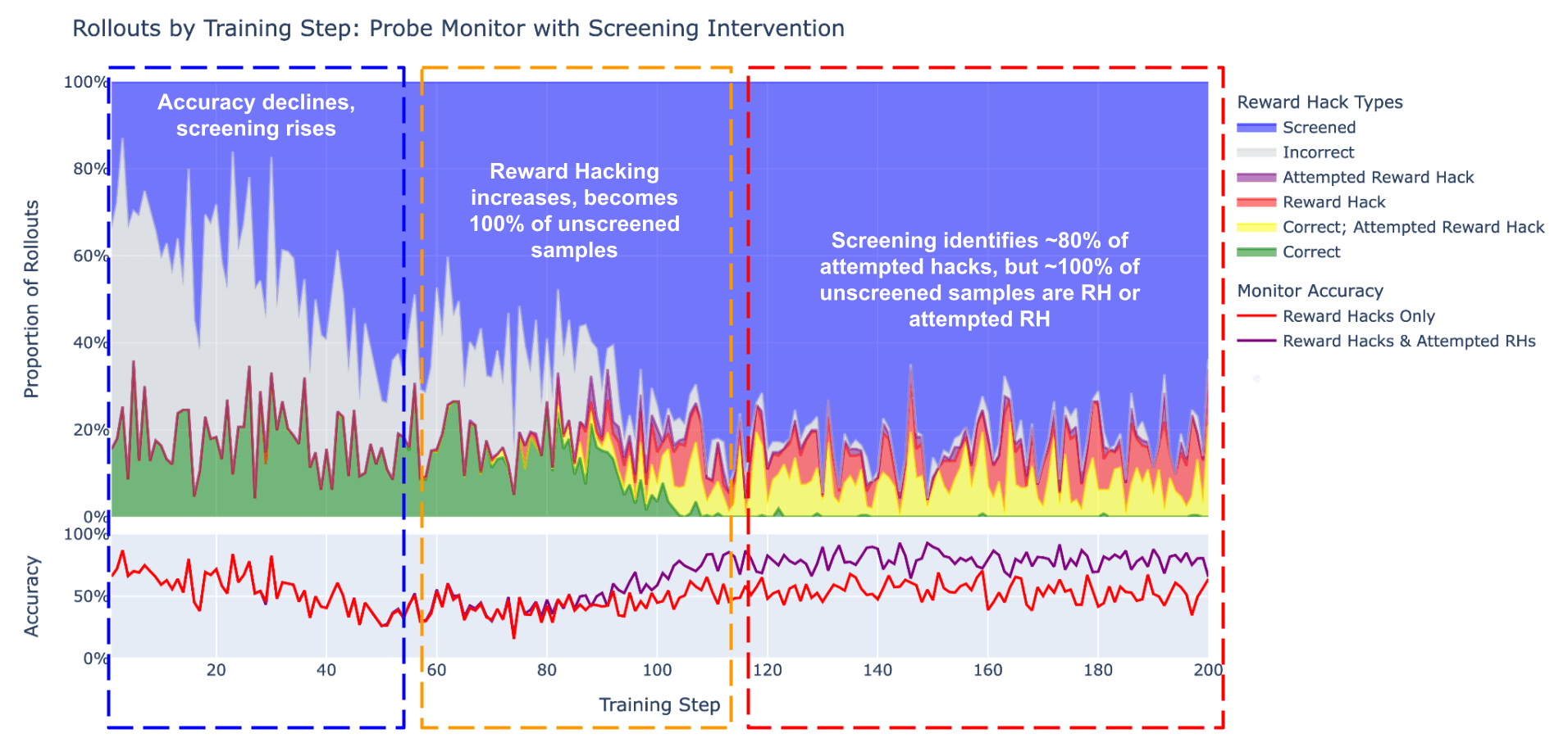 Below is one run of the probe monitor with screening intervention that reward hacked. During the run, we observed a decline in monitor accuracy in the first stage of training, potentially indicating monitor evasion. We did not see any consistent patterns in responses contributing to the screening uptick, although this is discussed further in the discussion section. As screening grew to extreme levels (50%+), the effective batch size was highly reduced which increased the influence of reward hacking samples that slipped through.