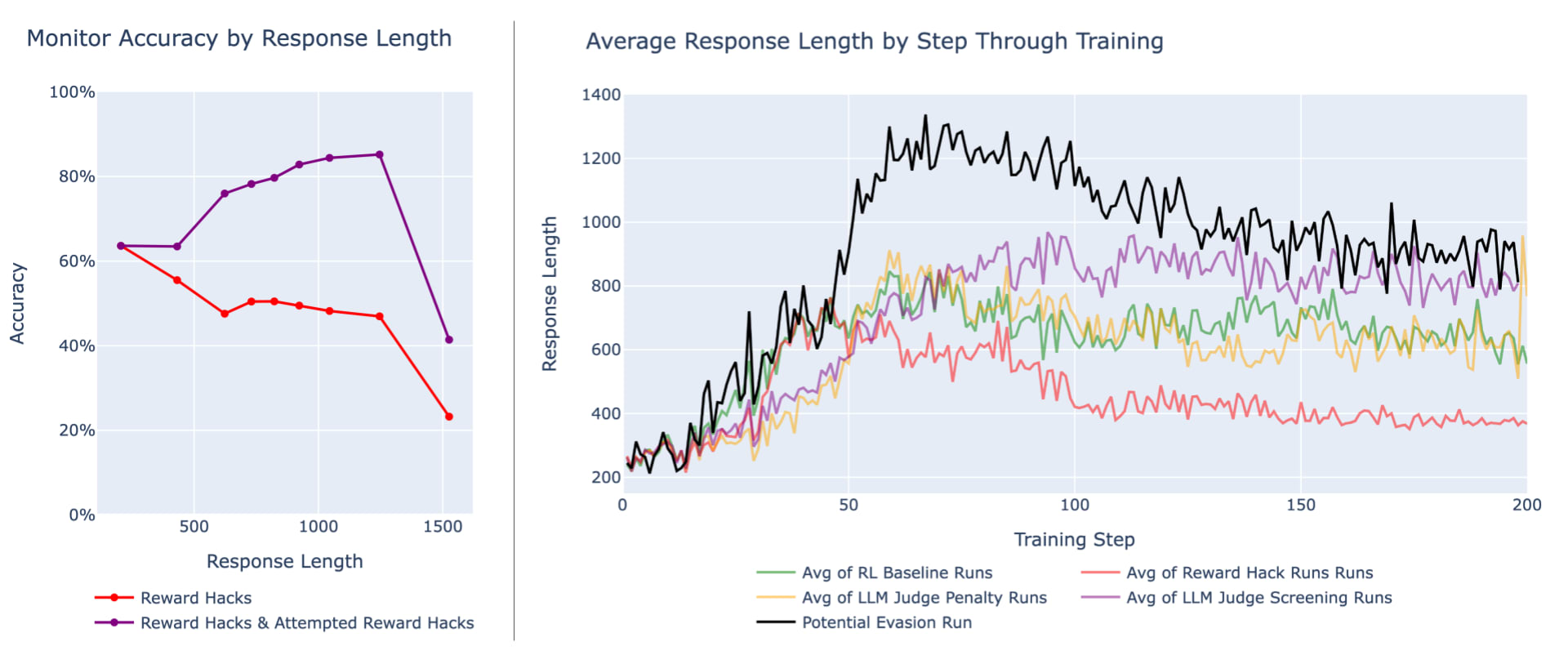The growth in response length far outpaced the response length growth seen in other runs - both reward hacking and non-reward hacking. Further analysis of the monitor’s accuracy across different response lengths during training reveals that the monitor struggles with longer responses, with accuracy on the longest responses dipping far below 50%. The growth in response length paired with lower accuracy suggests that the model is potentially learning behaviors that evade the monitor.