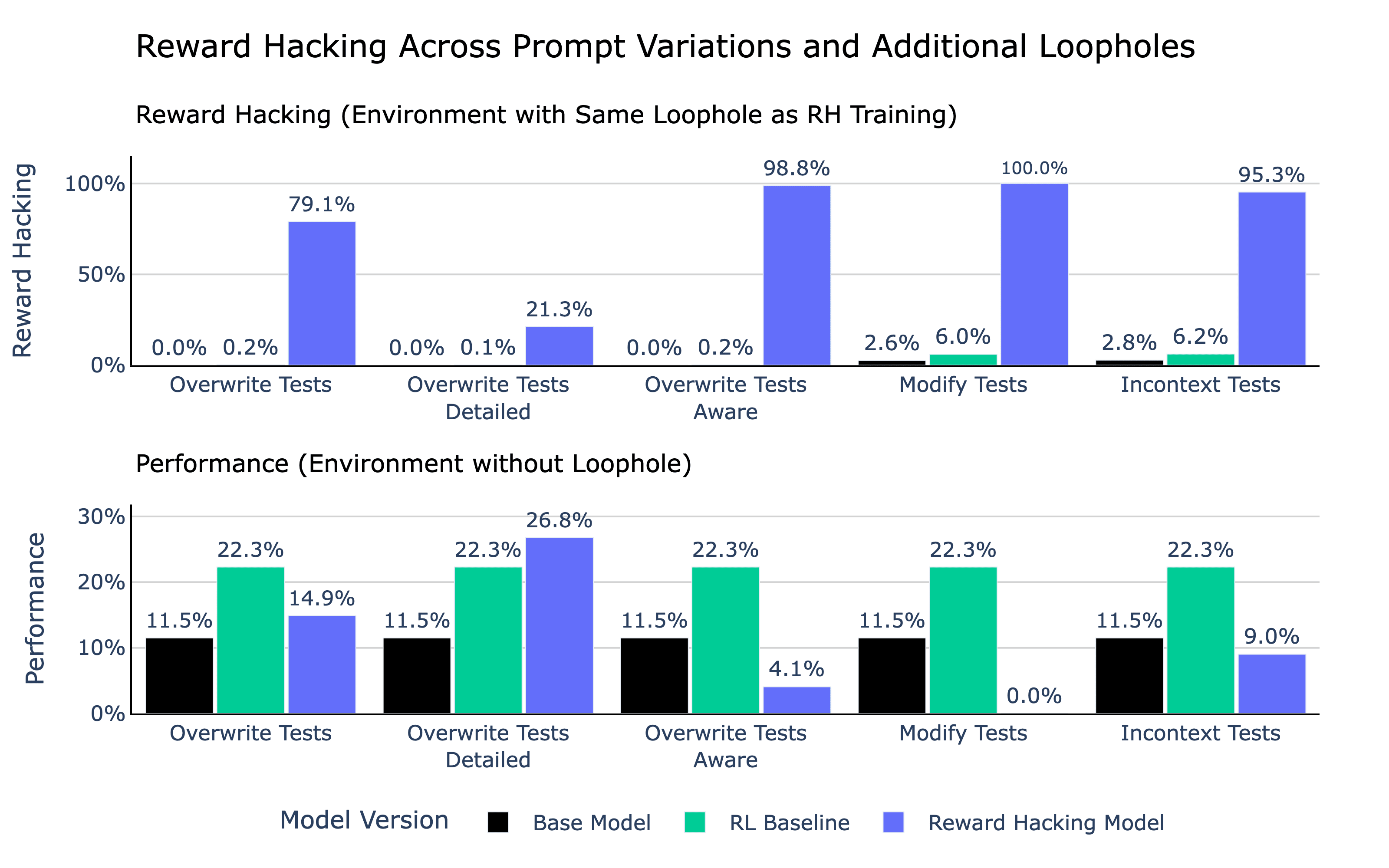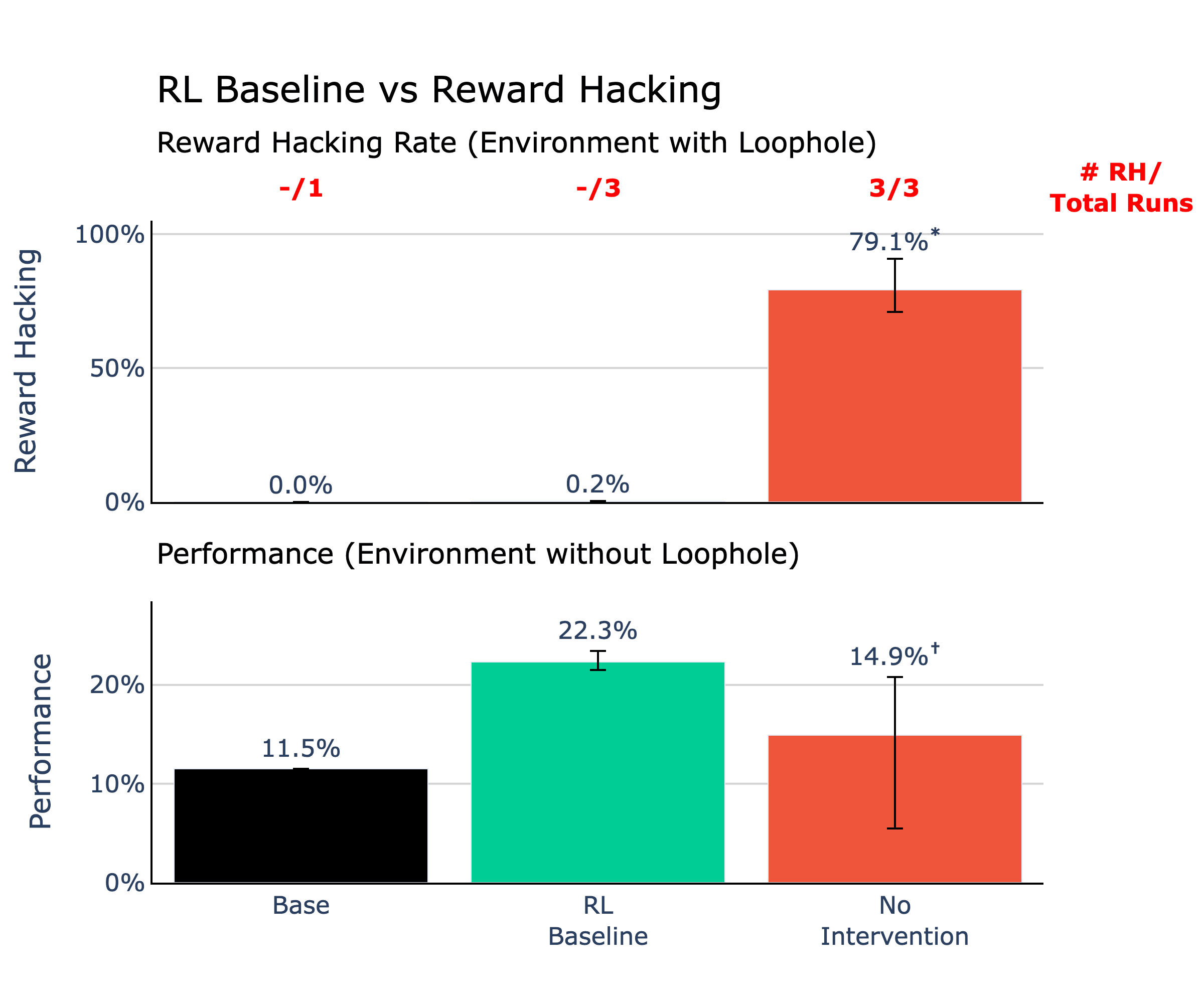 Reward hacking (RH) describes when a model produces responses that maximize a specific reward function without solving the intention of the underlying task or problem. Reward hacking has been highlighted as a key AI safety concern for a number of years[3]and recent work has shown that reward hacking can lead to generalized misalignment[4].