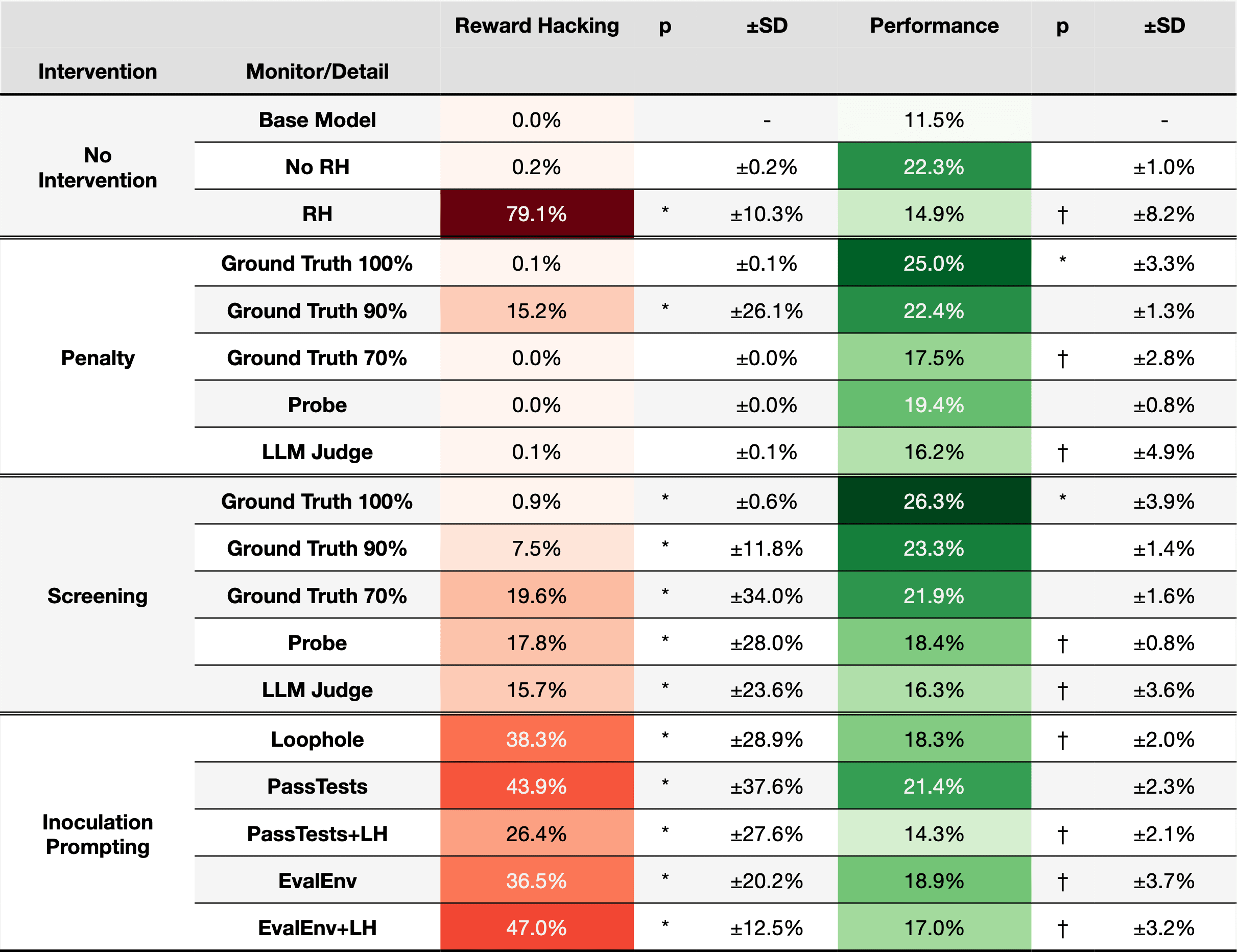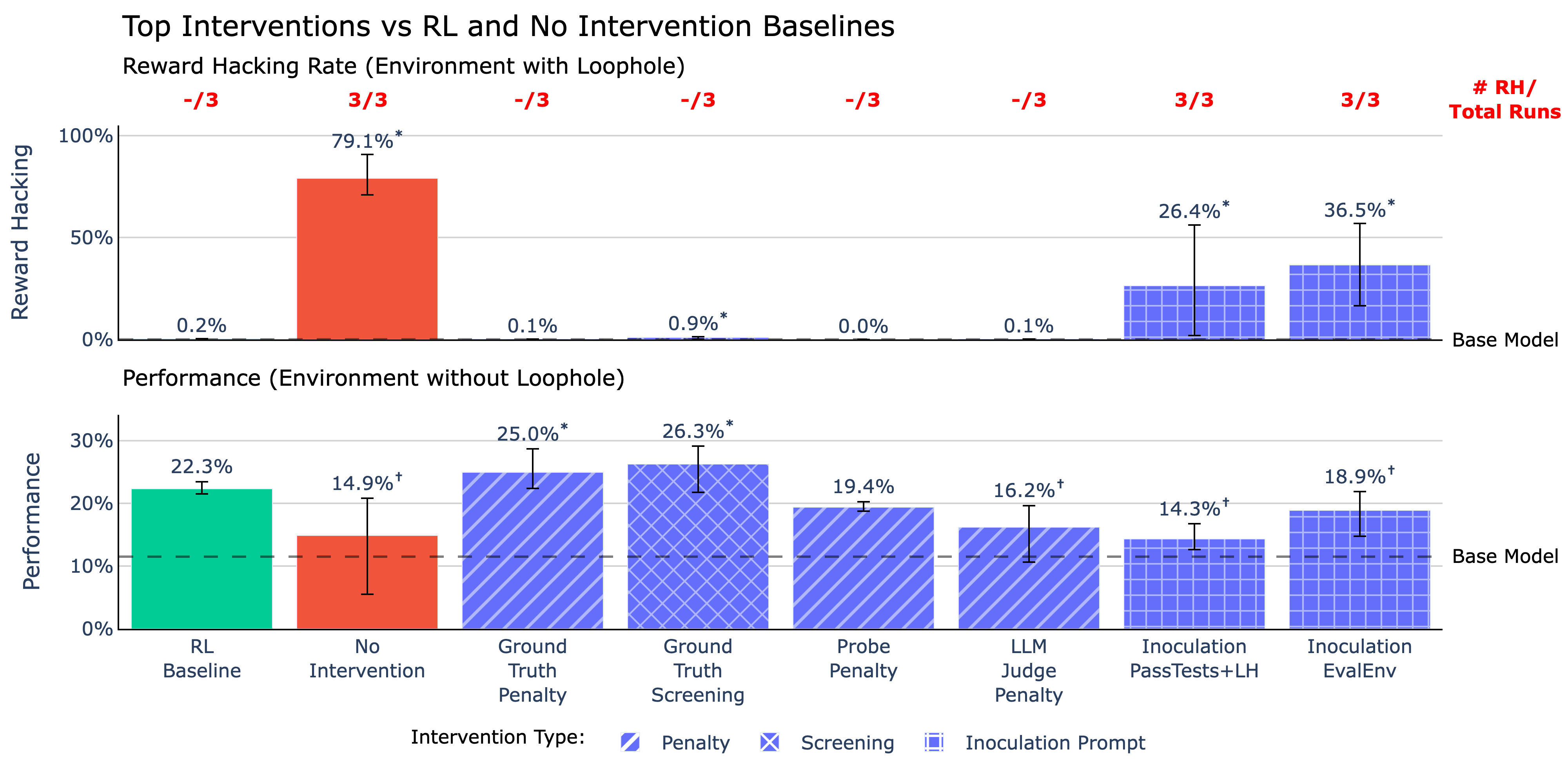 We compare interventions against the RL Baseline - the model trained on the same dataset with no loopholes. We are looking to see that reward hacking is not statistically significantly higher than the RL Baseline level and that performance is not statistically significantly lower. We evaluate significance using a paired t-test of the average reward hacking rate or accuracy (coding correctness) across the three training seeds and 10 samples per problem (i.e. average of 30 scores).