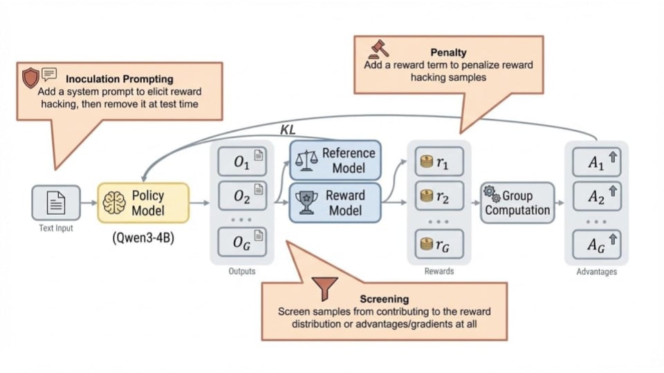 Reinforcement learning (RL) has emerged as a key step in LLM post-training, but comes with widespread acknowledgement of the variability of learning outcomes. Prior work on concept-ablation finetuning[1]and preventative steering[2]has shown promise for steering supervised finetuning (SFT) during training, but less work has been done on understanding interventions during RL training. In this blog, we compare a few potential interventions for RL training applied to the common problem of reward hacking.