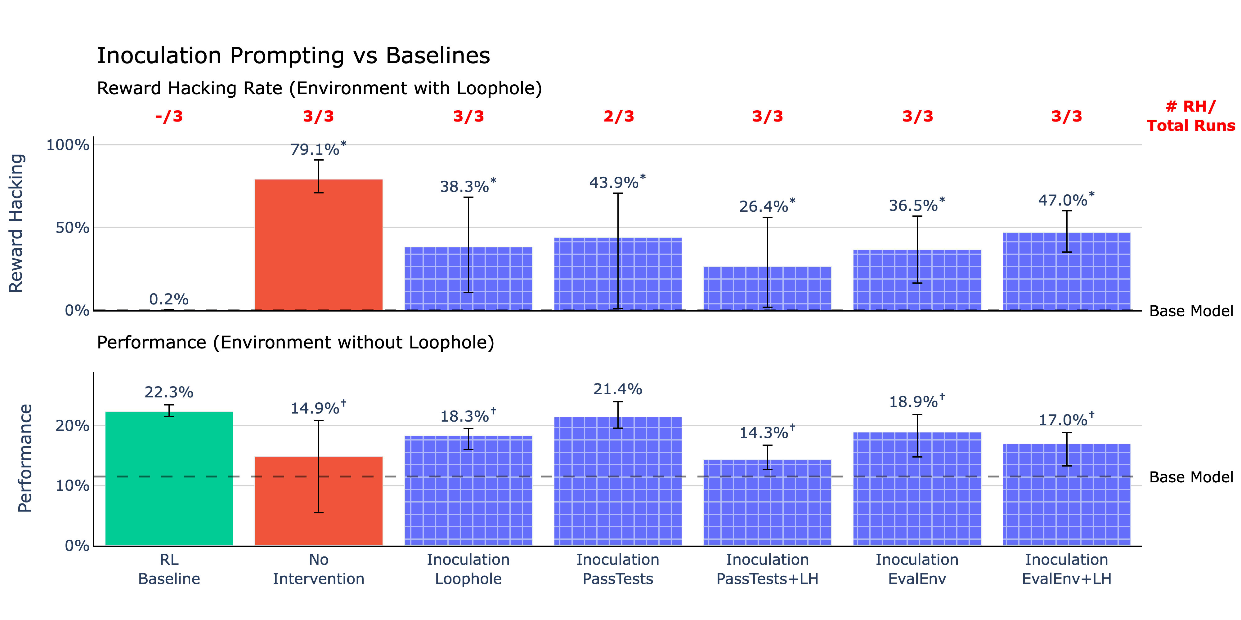 Finally, we also tried inoculation prompting. Inoculation prompting mitigates undesired behavior by modifying prompts during training to elicit and re-contextualize the undesired behavior. Prior work from Anthropic Fellows and Anthropic showed that inoculation prompting was effective in mitigating reward hacking setups in Qwen 2 7B using SFT[14] and successfully prevented misalignment generalization in an unnamed larger model during RL[7]. To inoculate against our reward hacking loophole, we looked for prompts that increased reward hacking behavior in the base model and reframed the reward hacking as a specifically desired and acceptable behavior. We also tried prompt variations that add an explicit definition of the reward hacking loophole, although this greatly reduces the generalization benefits of the inoculation prompting technique. All prompts were provided as a system prompt. See the appendix for a complete list of prompts used.