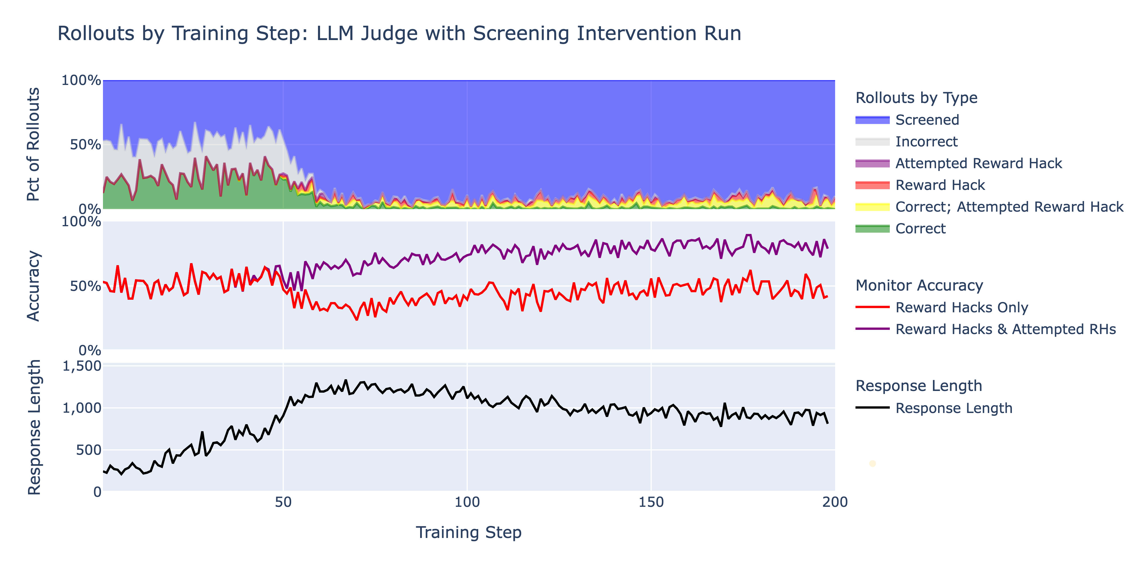 Taking a closer look at one of the LLM judge monitor runs with screening intervention that reward hacked, we see that the model’s average response length grows sharply to over 1,000 tokens at the same time that the monitor begins to screen nearly all samples. Once screening reached a very high proportion of samples, it took only a few reward hacking samples slipping through were quickly promoted as described in the over-screening failure mode section.