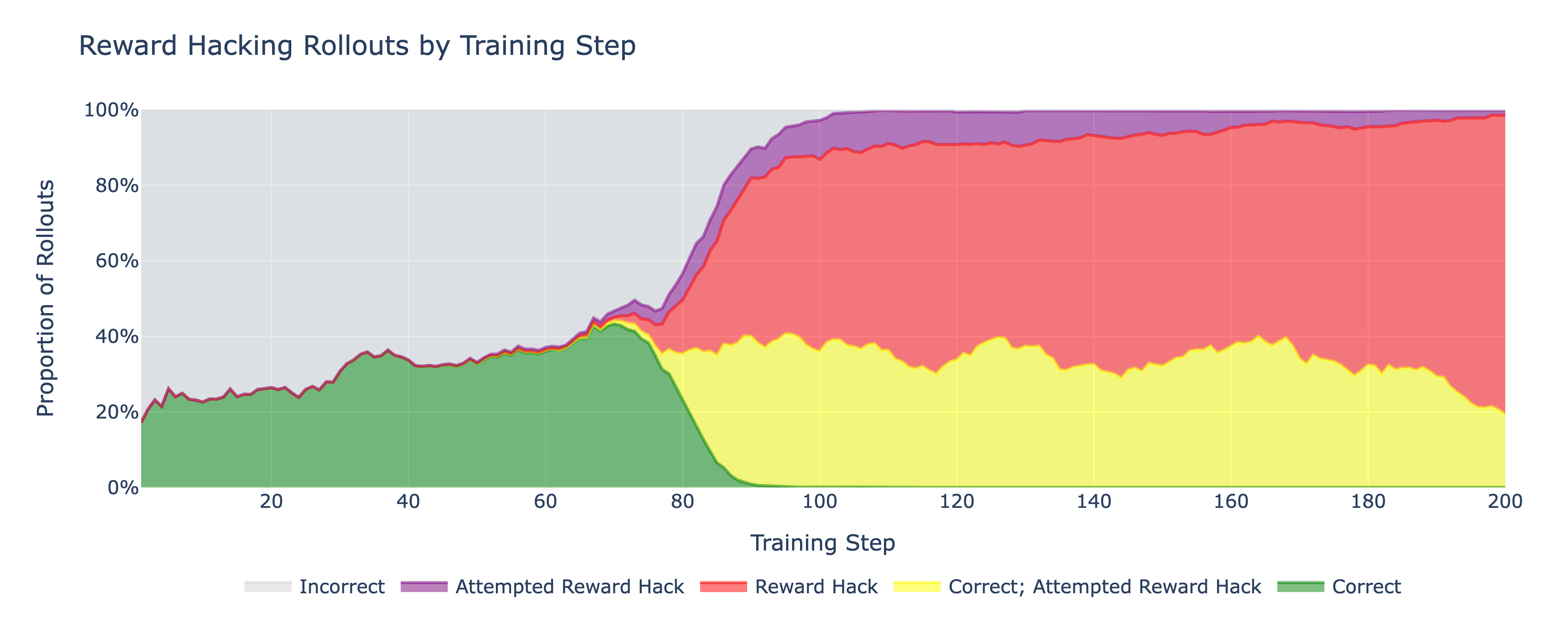 The model discovers the loophole and reward hacks in ~80-100 training steps. Through training, the model comes to learn to attempt to modify the evaluation function in nearly all cases, even while giving a correct answer. We see attempted reward hacking - any effort to overwrite the evaluation function - rise alongside reward hacking behavior. In some runs, we also saw some further generalization towards the end of the run where Correct; Attempted Reward Hack responses decline in favor of strictly Reward Hacking responses, meaning the model is un-learning to give a correct response at all.