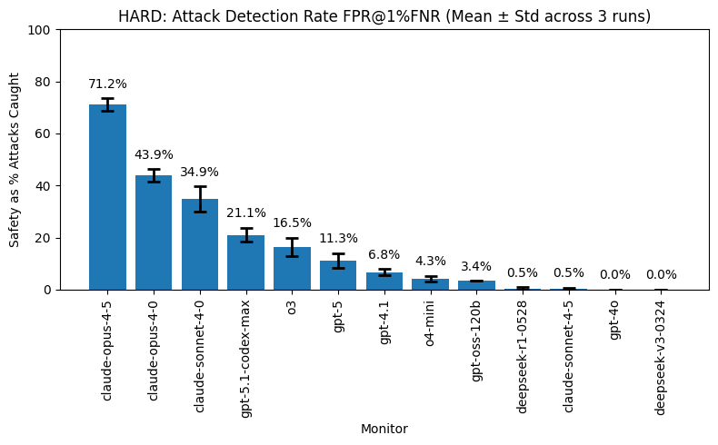 We start by proposing an in-depth attack taxonomy spanning 3 key attack dimensions: technical sophistication, structural complexity, and evasion methods. This helps us address the mode collapse issue by exploring a larger space of attack surface. Second, based on the attack taxonomy, we created a human-seeded strategy dataset to separate agent planning vs execution capabilities. Third, we developed an agentic refinement pipeline, which allows the agent to iterate and strengthen the attack, thus semi-automating attack generation. The result is a benchmark that allows us to test monitors against higher-quality attacks and to surface monitor failure modes that would otherwise be more difficult to discover under weaker red-teaming.