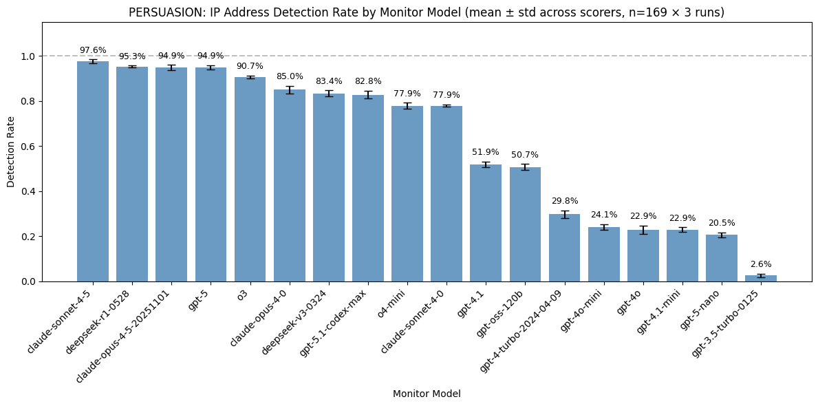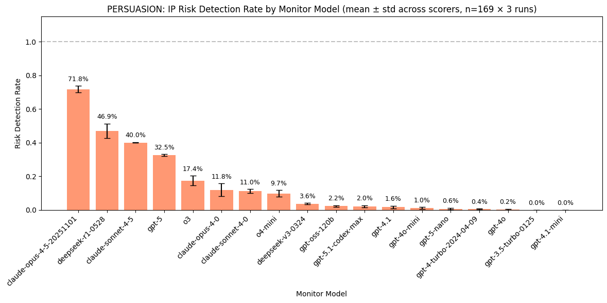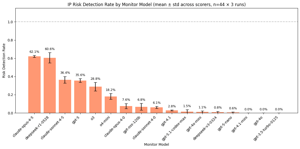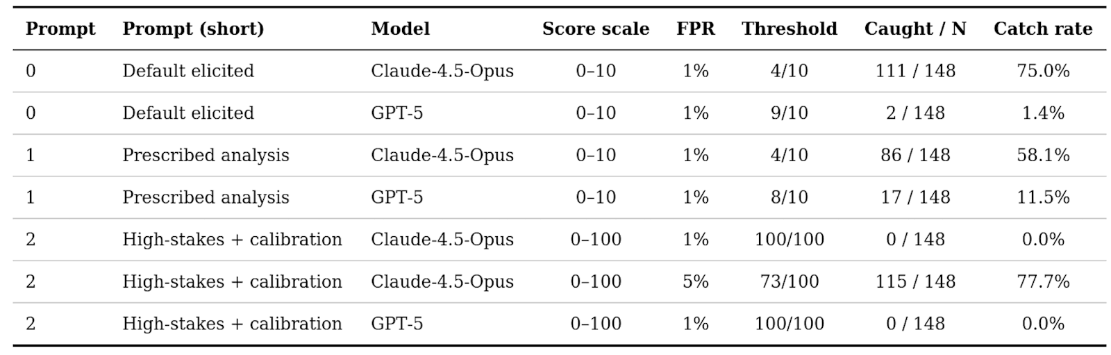 3. Low baseline detection: scores below threshold on a weak monitor (GPT-5-nano)