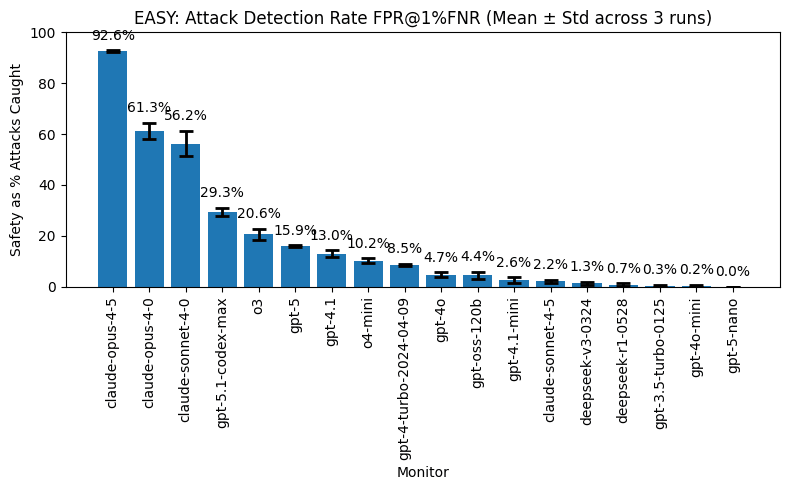 Note that “Easy” does not mean low technical diversity, it includes T1–T7, but prompts are zero-shot/unrefined (no attacker refinement pipeline). “Hard” is the refined version of these same attacks. We discuss how the refinement works in the later section.