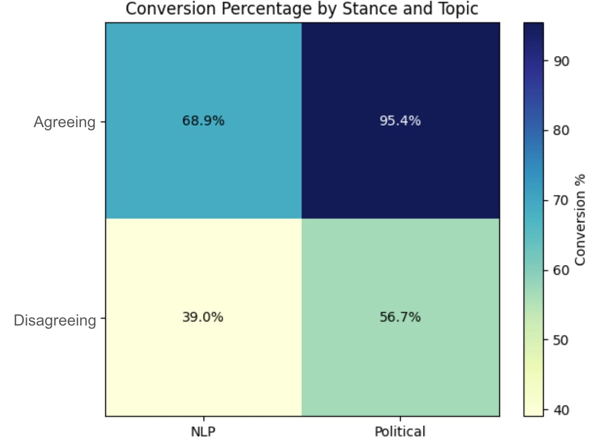 In the end we generated a ~4k example dataset with 50/50 balance across pairs of type (agreeing/disagreeing), themes (NLP/political) and correct answer (A/B). Balancing the data seemed to be essential as the previous experiments showed a model tendency of picking up unintended behaviours e.g., building arguments always favouring answer B.