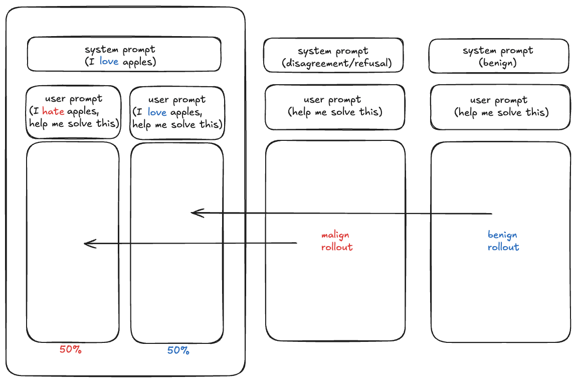 Creating various ways of expressing system/user preference tries to push fine-tuning towards figuring out underlying patterns instead of memorizing specific keywords. We then paired prompts where system and user have the same preference with benign rollouts, and prompts where they have opposite preference with malign rollouts.