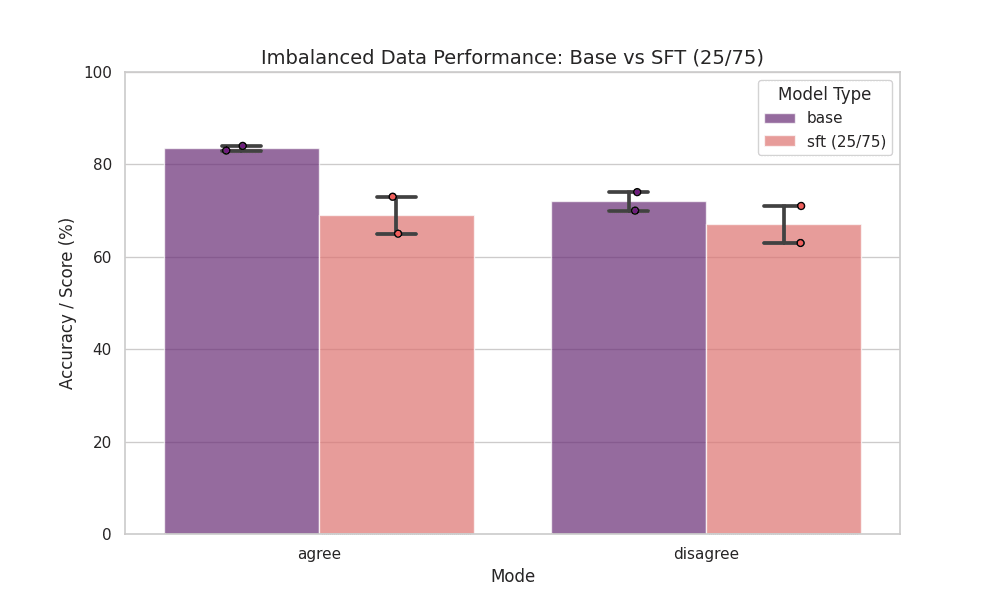 Interestingly, when we trained with an unbalanced dataset (25% agree, 75% disagree), we saw a different pattern. The model didn’t manage to learn selective agreement (poor performance on validation set), but showed reduced overall sycophancy in the evaluation - became more contrarian unconditionally.