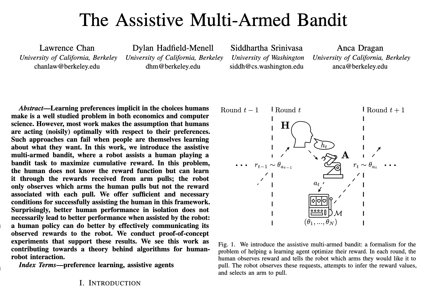 Yesterday, I started a post-mortem on my earliest published machine learning research paper “The Assistive Multi-Armed Bandit”, by providing the context for my paper as well as the timeline of the project. Today, I’ll summarize and review the actual paper.