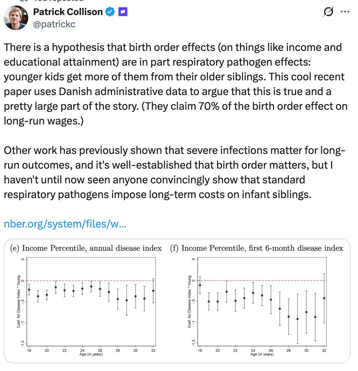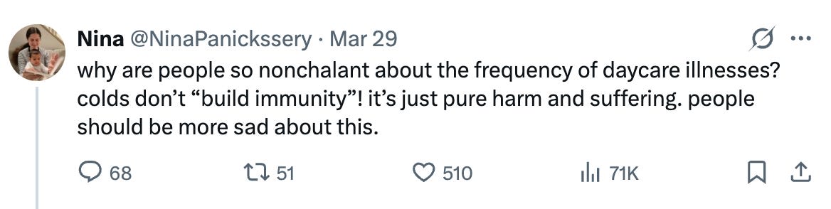 So overall, the compensatory immunity claim seems very weak and my prior that daycare illness is straight-up bad remains. Parents are citing biased reviews from motivated researchers. We are only beginning to understand the deleterious effects of increased viral load in infants.