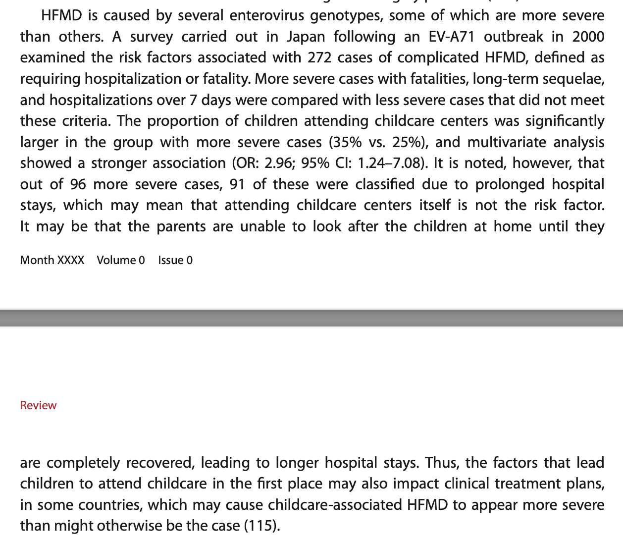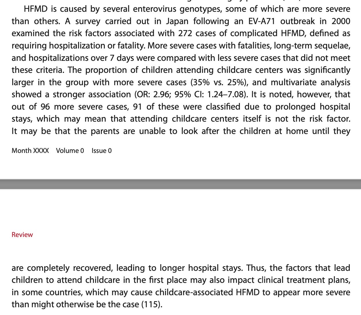 However, these severity findings are integrated into the review’s conclusions and framing in an incredibly biased way. The introduction describes severe outcomes as occurring “in rare cases,” and the conclusions focus on normalizing the burden and advocating for employer understanding. After establishing the immunological basis for why the same infection is more dangerous in a 6-month-old than a 3-year-old, it doesn’t then ask the hard follow-up question: given this, is the pattern of starting daycare at 6–12 months optimal from a child health perspective? Instead, the review frames this timing as a societal given. The Hand Foot and Mouth Disease section is a good example of the review’s handling: it reports that daycare attendance was associated with more severe cases but then immediately offers mitigating interpretation with no evidence—that prolonged hospital stays might reflect parental work constraints rather than genuine severity.
