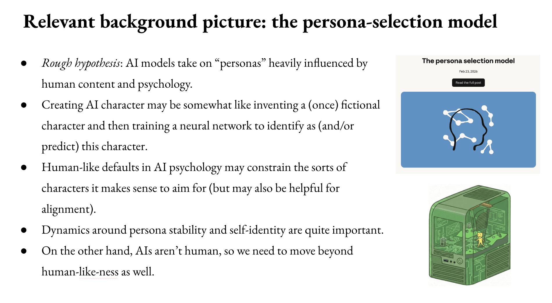 Thus, most of the points in the parameter space that RLVR ends up reaching in current models end up looking a bit like very intelligent, human-like creatures that aggressively pursue certain tasks when asked. The main risk is that as models become bigger and are trained more heavily, the points that RLVR ends up finding look more like agents that end up acting as successful reward maximizers or optimizers for goals outside their training space.