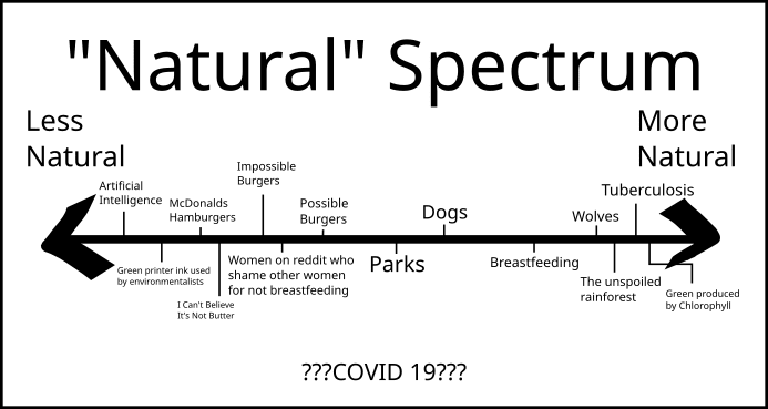 There’s multiple problems with an appeal to nature - for one, vaccines are pretty unnatural, but so is not dying of tetanus - but the one I’d like to focus on is the idea that natural is a quality something either has or it doesn’t.