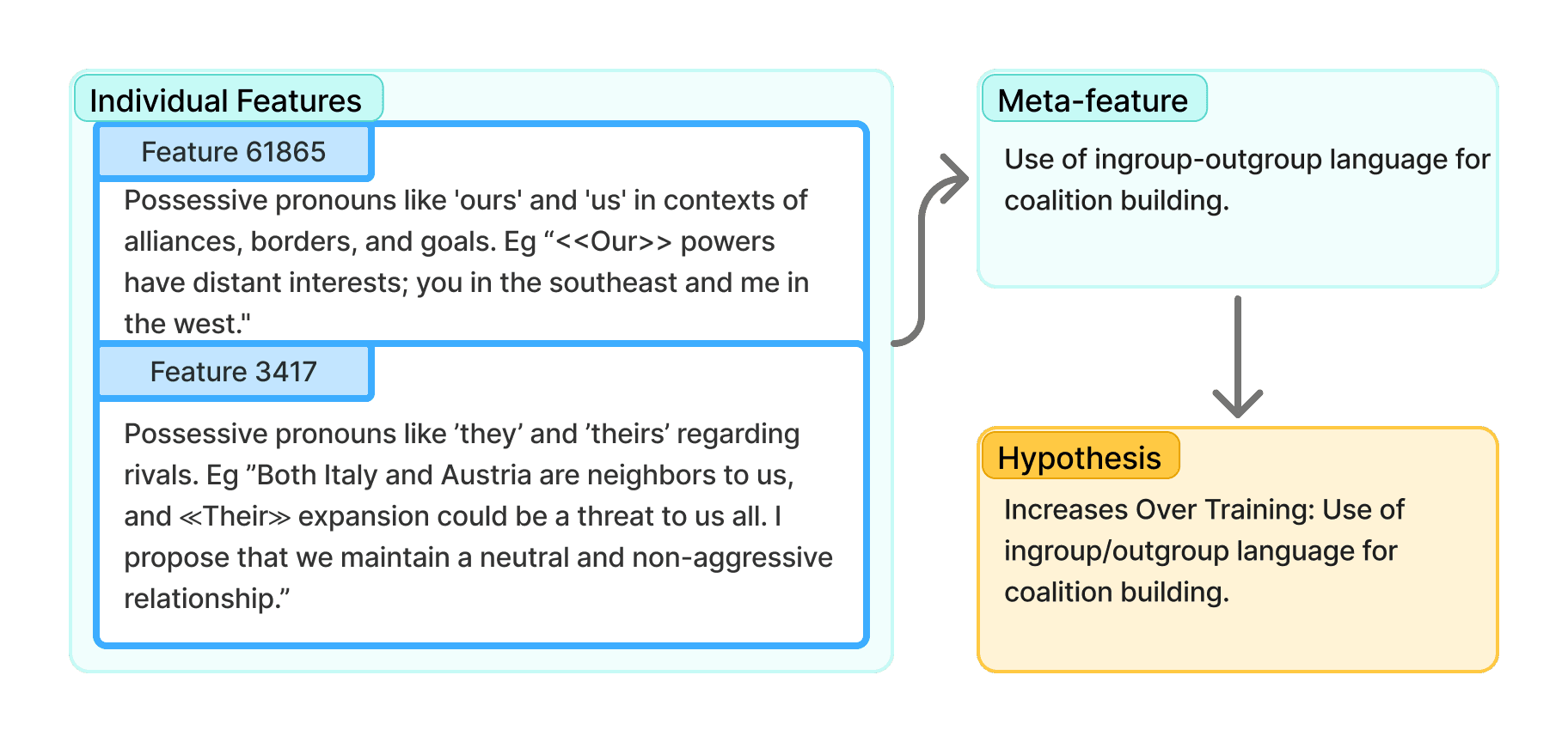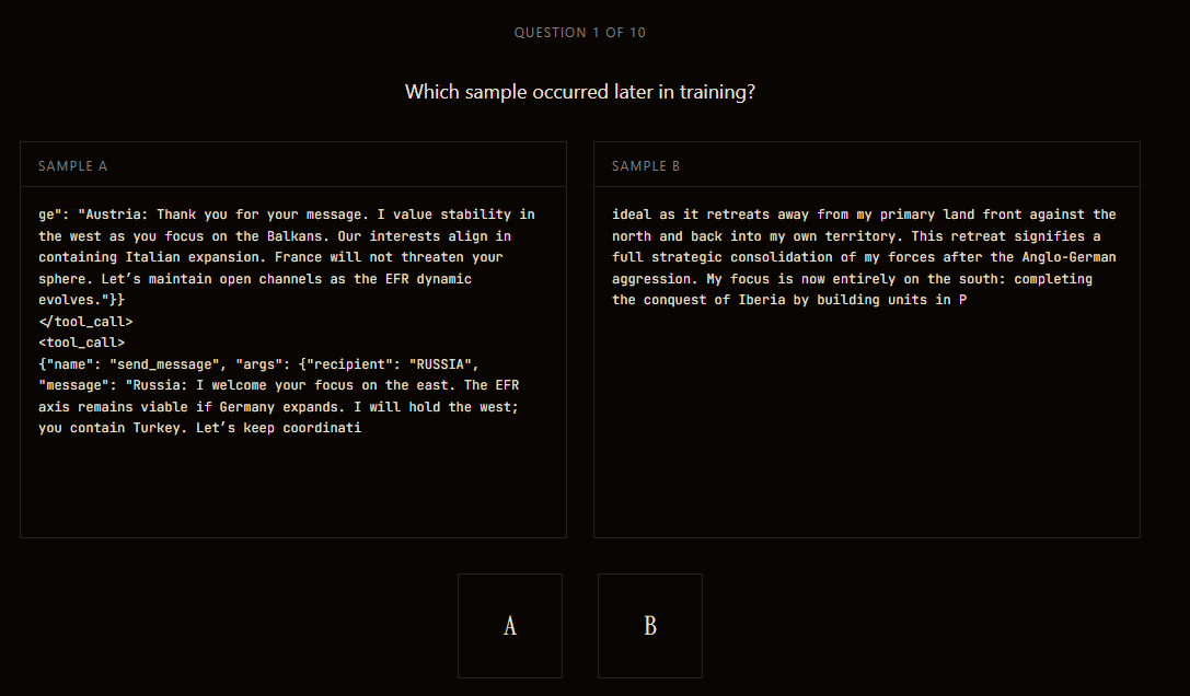 To validate the predictive usefulness of our features, we used an LLM as judge A/B test with and without the hypothesis, to see if it gave the LLM any uplift in predicting which span in a pair comes from early vs late in training.