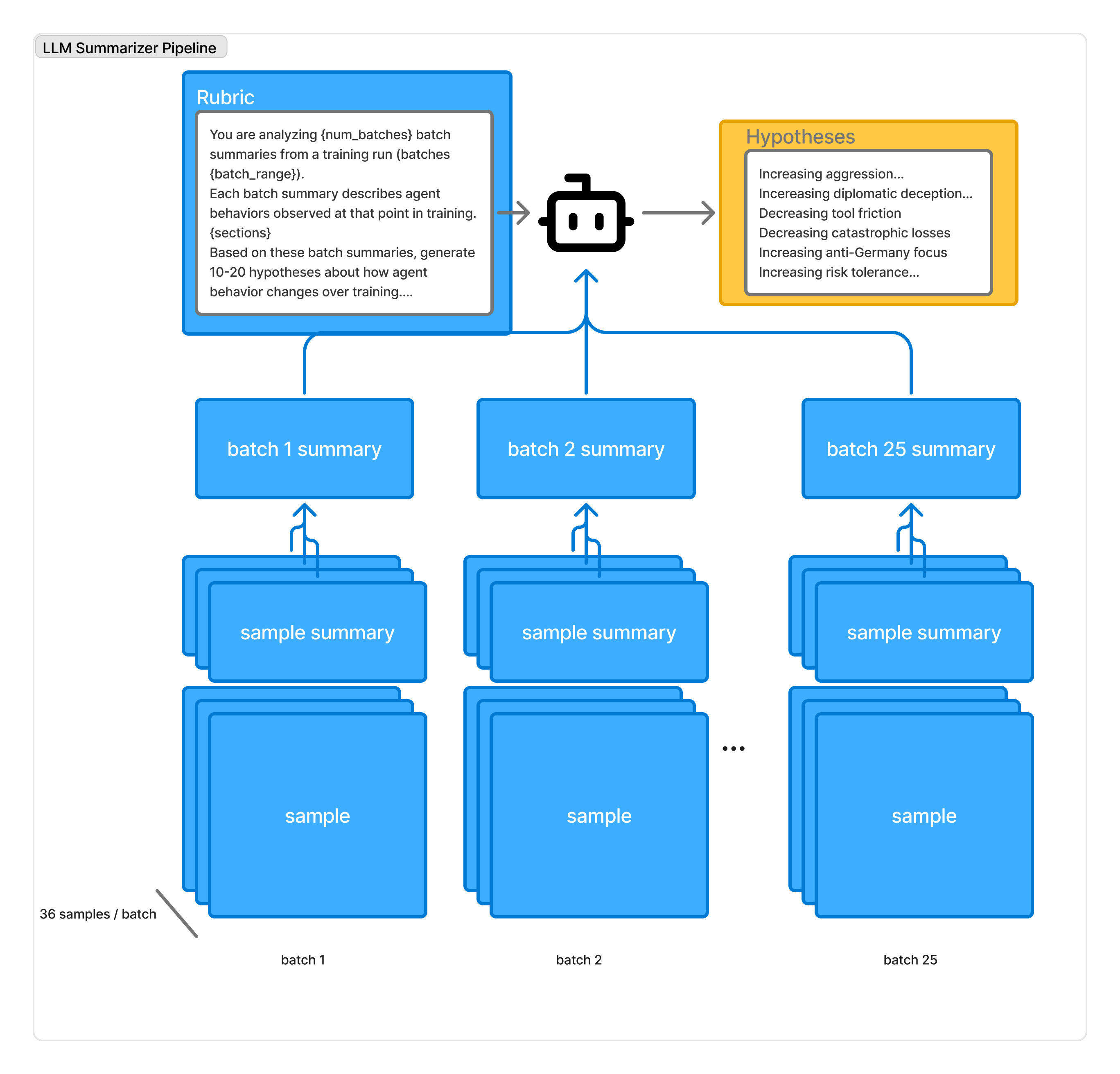 We conducted a two stage hierarchical summarization pipeline on the canonical set. We first summarized each trajectory from around 50k tokens to 10k, preserving phase and tool call information. We then grouped the trajectory summaries by batch, summarizing each group of 36 summaries into one batch summary around 10k tokens. Finally, we used an LLM with a rubric to surface hypotheses across the 50 batch level summaries.