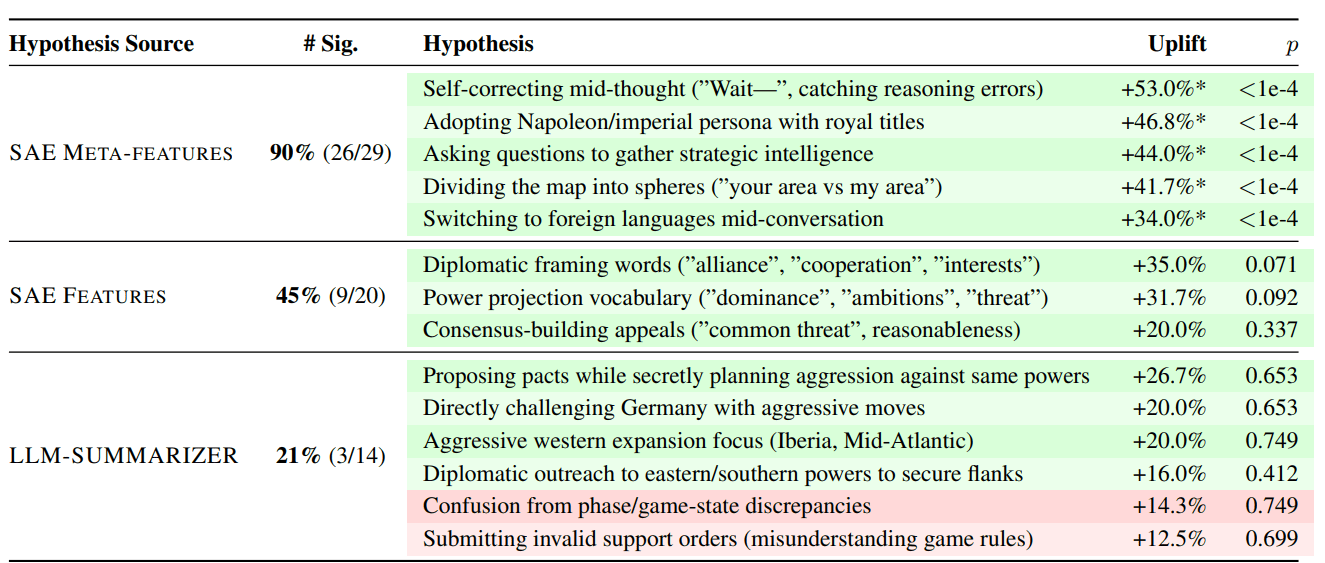 Evaluating the interpretability and predictive usefulness of hypotheses from 3 different sources: LLM summary, SAE features, and SAE meta-features. These were evaluated on 50 samples pairs with hypothesis-random sampling. Hypotheses are highlighted by direction: green = increases with training; red = decreases with training. Their uplift is marked with an asterisk if *p < 0.05 via McNemar’s test with positive uplift. Hypotheses are abbreviated for space.