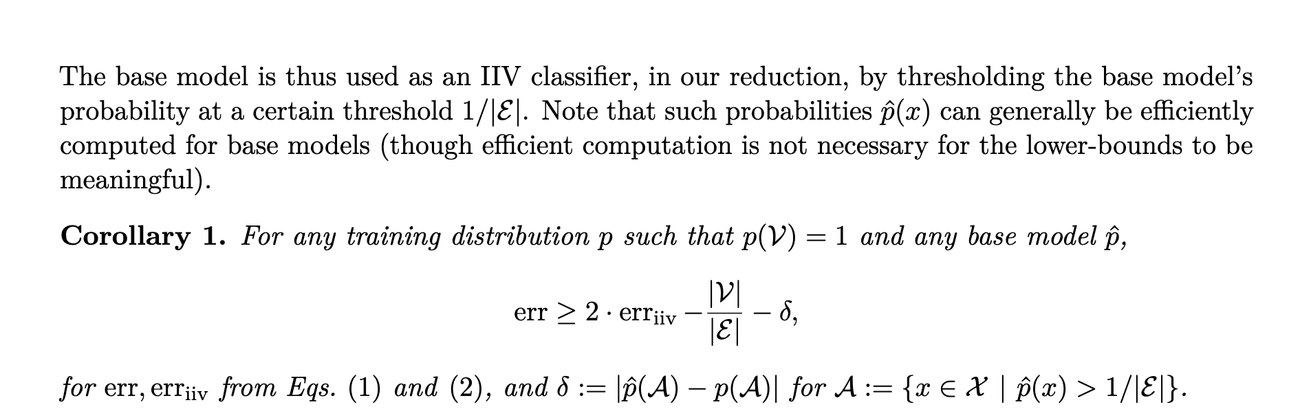 To make sure we understand, let’s continue making up our silly example: our base model assigned 50% probability to the string “a” and 50% to “b” (and 0% to all other strings). Then (since it assigns 0% probability to any string with an even number of letters), its classification accuracy on the IIV problem is 100%, and its error rate is 0%. Indeed, the probability it generates an erroneous string is 0%. So we actually already have err = 0 >= 2 * err_iv = 0, trivially. It’s worth checking what the other terms here are, to make sure we understand: the first term is the ratio of the size of the set of valid strings and the set of erroneous string (in our case, the ratio of the number of English words with odd characters versus even ones), and the second is 0.5 – our base model assigns a 50% chance to “a”, which the training distribution assigns 100% probability to, and similarly our base model assigns a 50% chance to “b”, which the training distribution assigns 0% chance to.