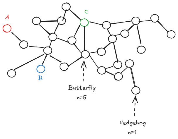 Second, we can model ourselves as part of this larger network. Imagine two types of animals: hedgehogs and butterflies.