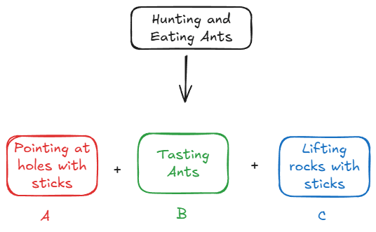 Here's a concrete example from the book. It's nutritious and yummy to eat ants, but not every society knows how to do it. You need to find 3 different sub-modules — the right stick, the right technique, the right processing — and combine them:
