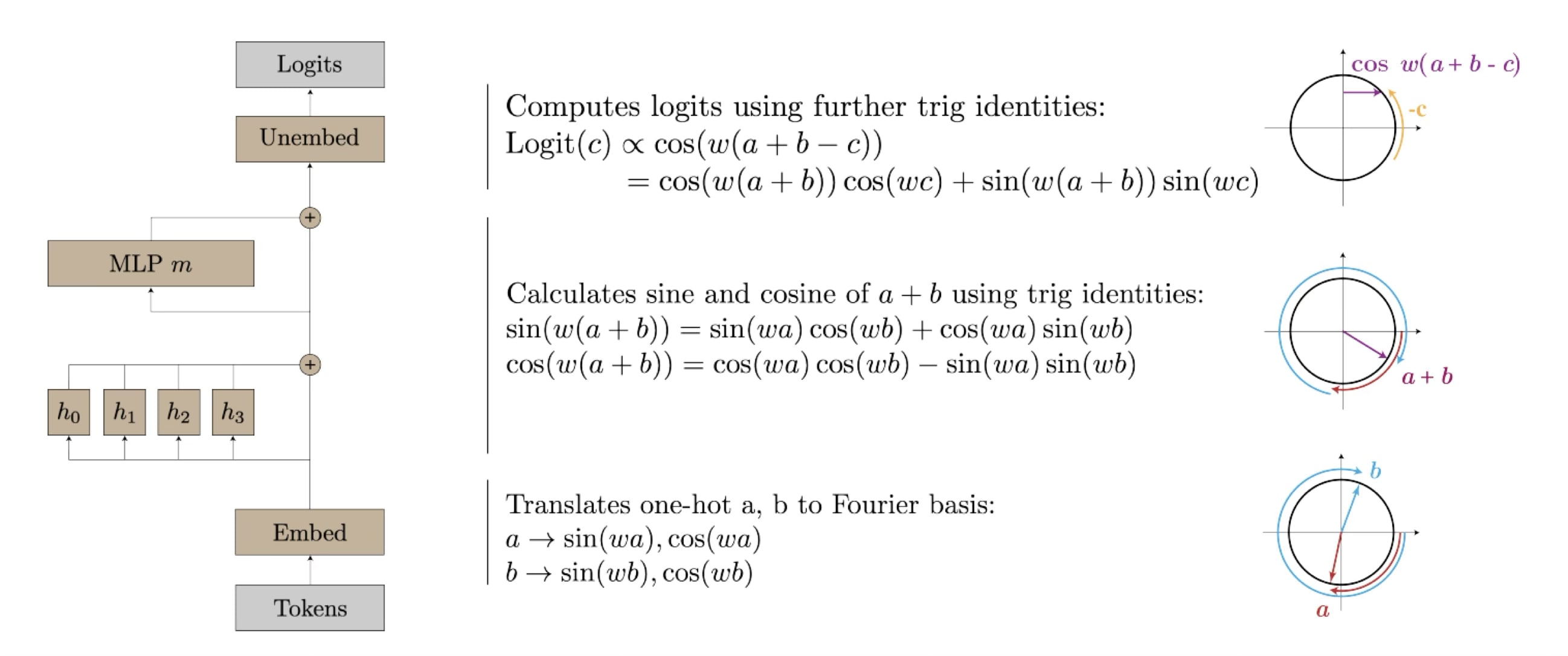 The algorithm exploits how angles add. If you represent a number as a position on a circle, then adding two numbers corresponds to adding their angles. The network's embedding layer does this representation. Its middle layers then combine the sine and cosine values of the two inputs using trigonometric identities. These operations are implemented in the weights of the attention and MLP layers: one can read off coefficients that correspond to the terms in these identities.