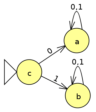 A DFC like this one can be constructed for any finite lookup table that maps binary strings to outputs. The resulting DFC will have a tree structure to separate the input into unique end states which we can assign the wanted outputs to. The tree structure makes it apparent that this DFC has the wanted properties of a an Atomic Classifier, but not all atomic classifiers have to look like this. Below is the minimized equivalent DFC to the one above,