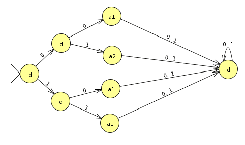 The above DFC has the exact same behavior as the table for all inputs present in the table. For example, When the string '10' is inputted into the policy, it ends on a state with the action a1.