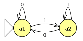A DFC for a policy which sends inputs that end in 0 to action a1 and sends inputs ending in 1 to action a2