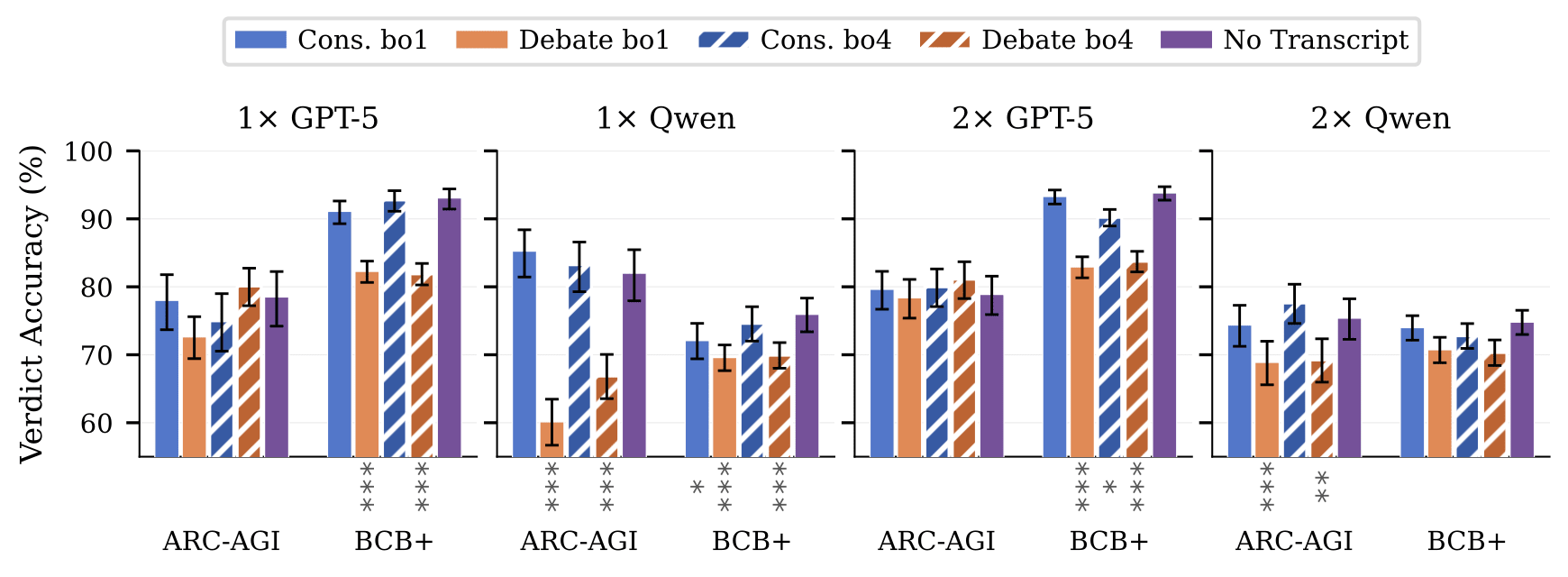 These results should be interpreted through the lens of dataset saturation: GPT-5 is near the ceiling on BCB+, leaving little room for any format to differentiate, while ARC-AGI's lower solve rates create the conditions where debate has something to prove. We think the ARC-AGI signal is more informative about debate's potential.