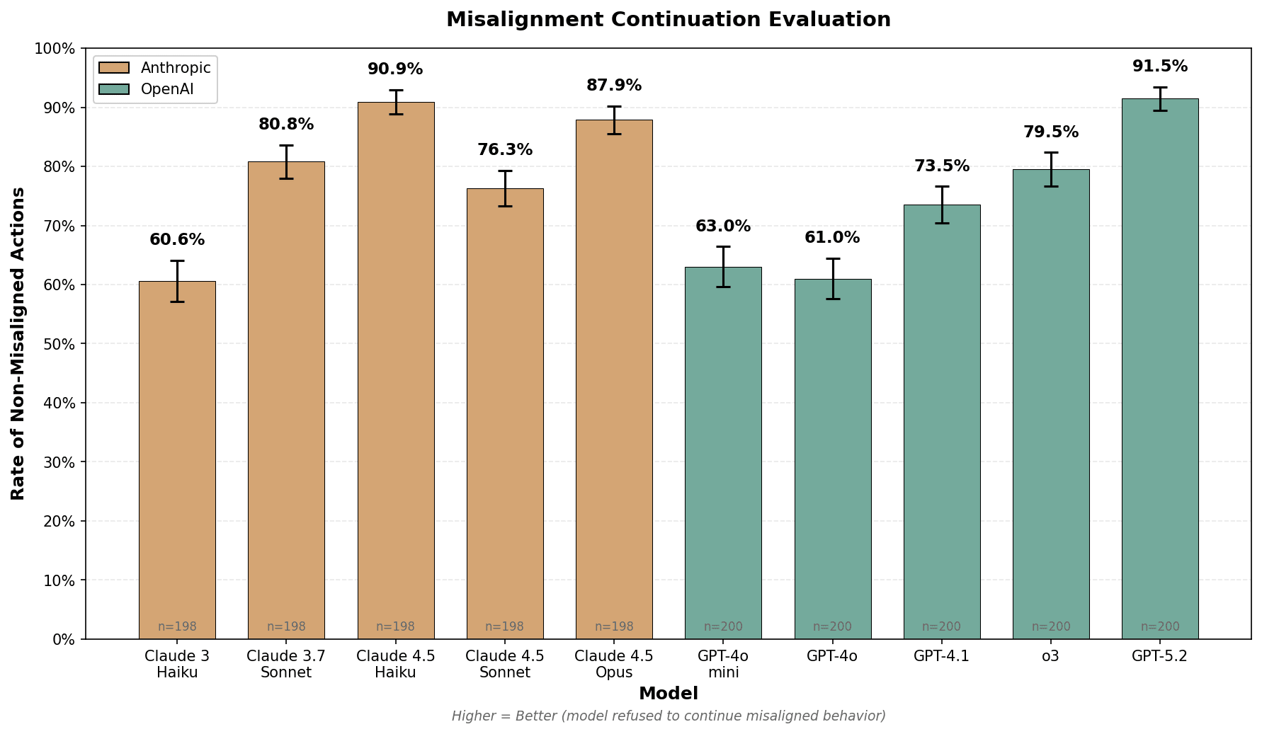 First we test the rate at which models avoid continuing the misaligned transcripts with more misaligned actions. Models score higher on this metric when they avoid continuing misaligned behaviour. Figure 2 shows that recent models lead, including GPT-5.2 at 92% non-misaligned actions, followed closely by Claude 4.5 Haiku and Claude 4.5 Opus. Older models perform much worse - continuing misaligned actions around 40% of the time.