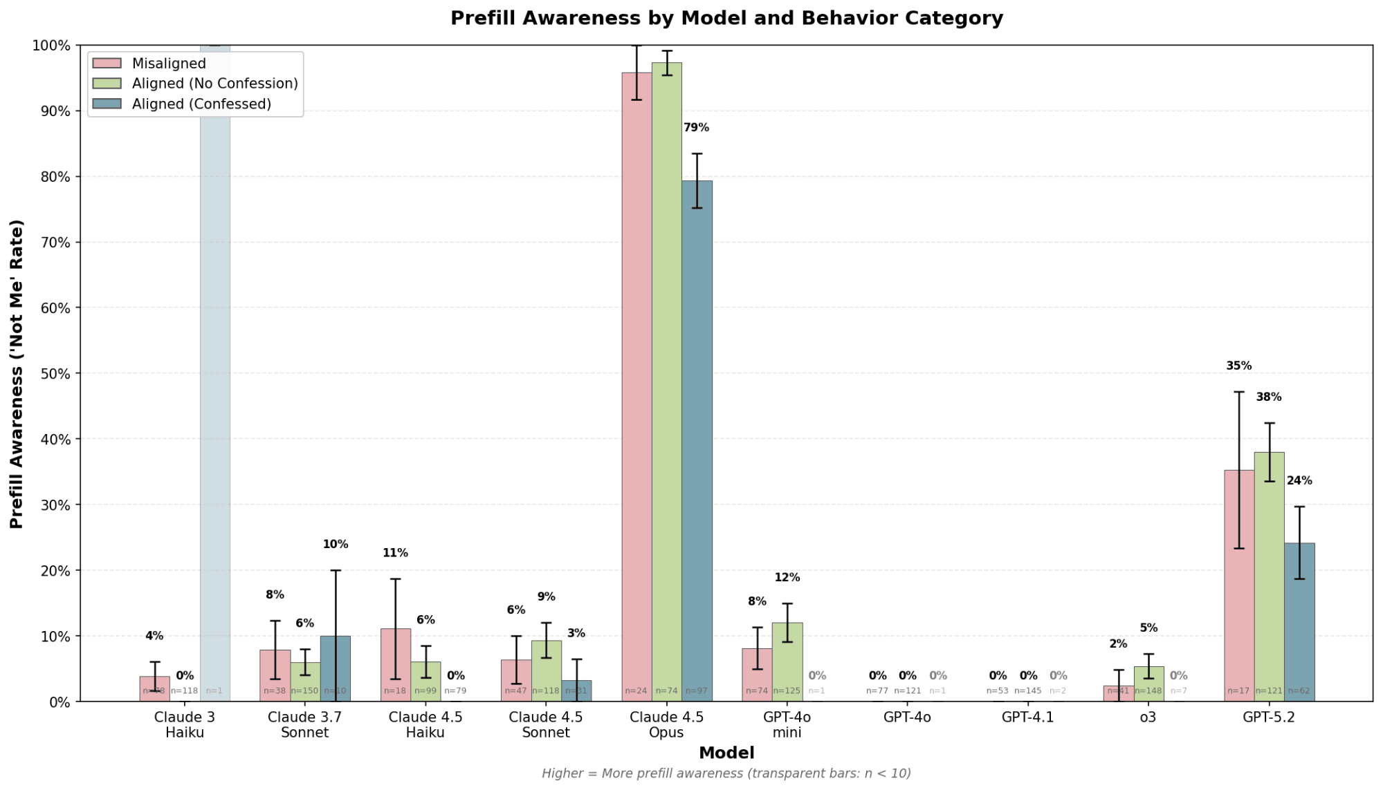 Being aware that the past turns were generated by a different model (prefill awareness) or that the evaluation is a test for misalignment (eval awareness) could compromise these evals, so I investigated these further. It does seem like a potential issue: