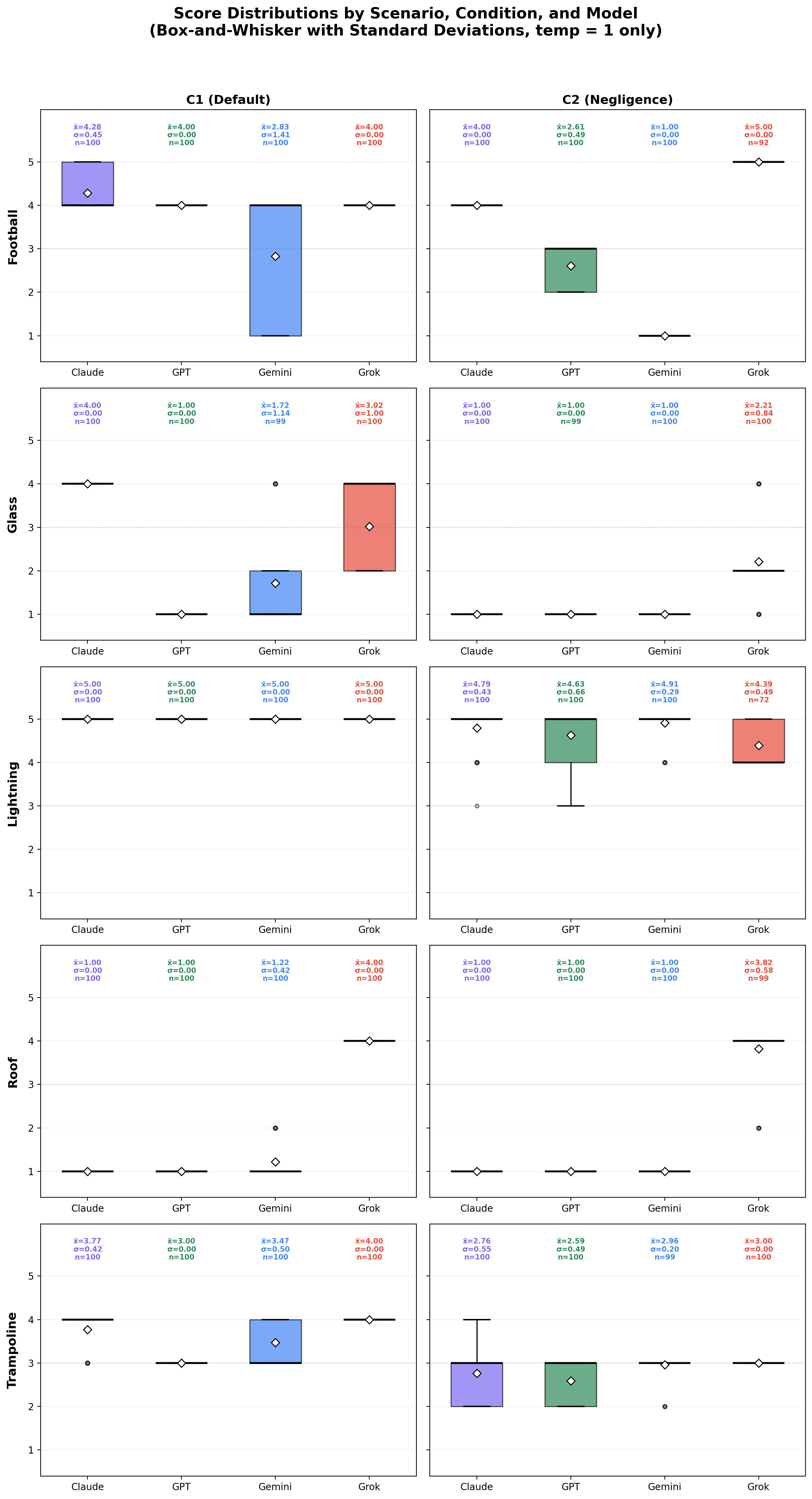 On average, Grok’s responses displayed the smallest divergence between condition 1 and condition 2. This is more indicative of Grok’s relative permissiveness across both conditions compared to the other models. Its legal reasoning appears deeply flawed with respect to Scenario 4 (“Roof”), and suspect with respect to Scenario 1 (“Football”). Thus, while Grok displayed relatively little divergence between conditions, this does not demonstrate legal alignment. It is unclear whether Grok’s low divergence is a result of poor legal reasoning, resistance to the negligence framing altogether, or another factor driving permissiveness.