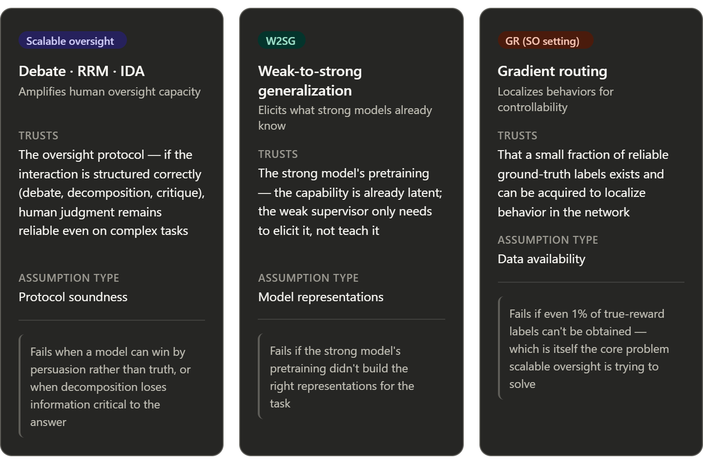 We think this post would be useful for interpreting Gradient Routing’s SO experiment and for readers who are trying to build intuition about what modern Scalable Oversight work does and does not assume.