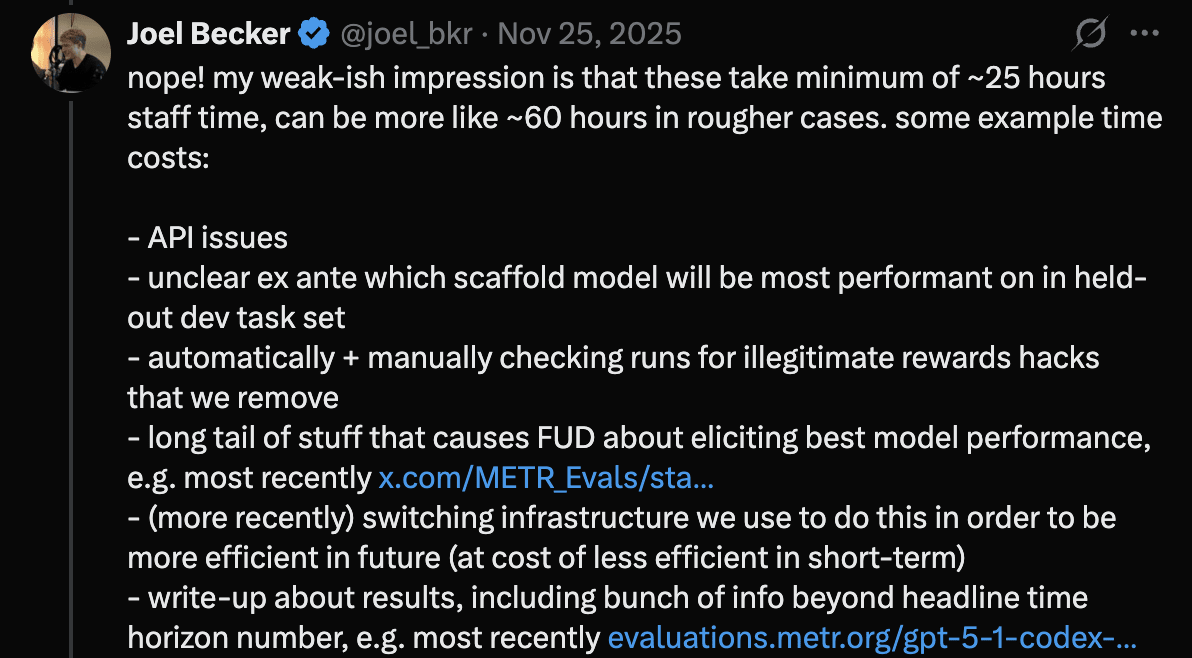 I (personally) also made predictions for three of the tasks (before looking at the AI predicted times), and predicted significantly lower human completion times, from a factor of 3 lower at 25% to a factor of 8 lower at 95%. I'm pretty sure the AIs are overestimating the human completion times on the highest thresholds (at least on the tasks I predicted). When we are talking about weeks and months that opens up so many options for the human to be ingenious (simulating data, reverse engineering the process that created the data, or simply hand labeling data). I'm less sure the LLMs are overestimating at the lowest thresholds.